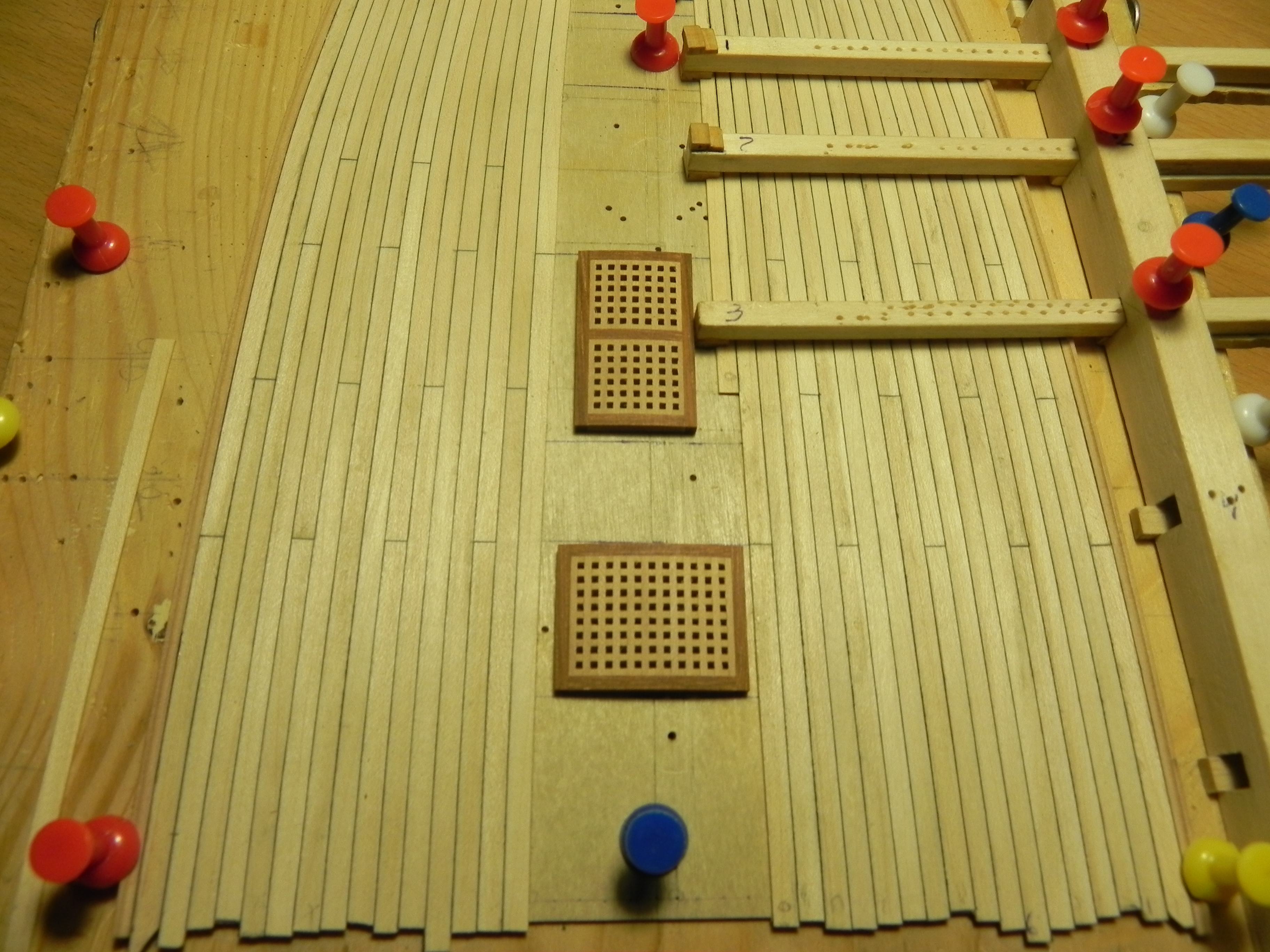 Игорь, я размечал только относительно гвоздевания, чтобы чопики проходили по торцам решеток. Не стал делать как на нижней палубе, где сначала разместил решетки, а от них уже пошли доски. Здесь решетки лягут на настил, а уж как получится. На этой палубе идет заужение досок и трудно сделать верный расчет.Да и фото много смотрел, там тоже люки лежат просто   на досках.