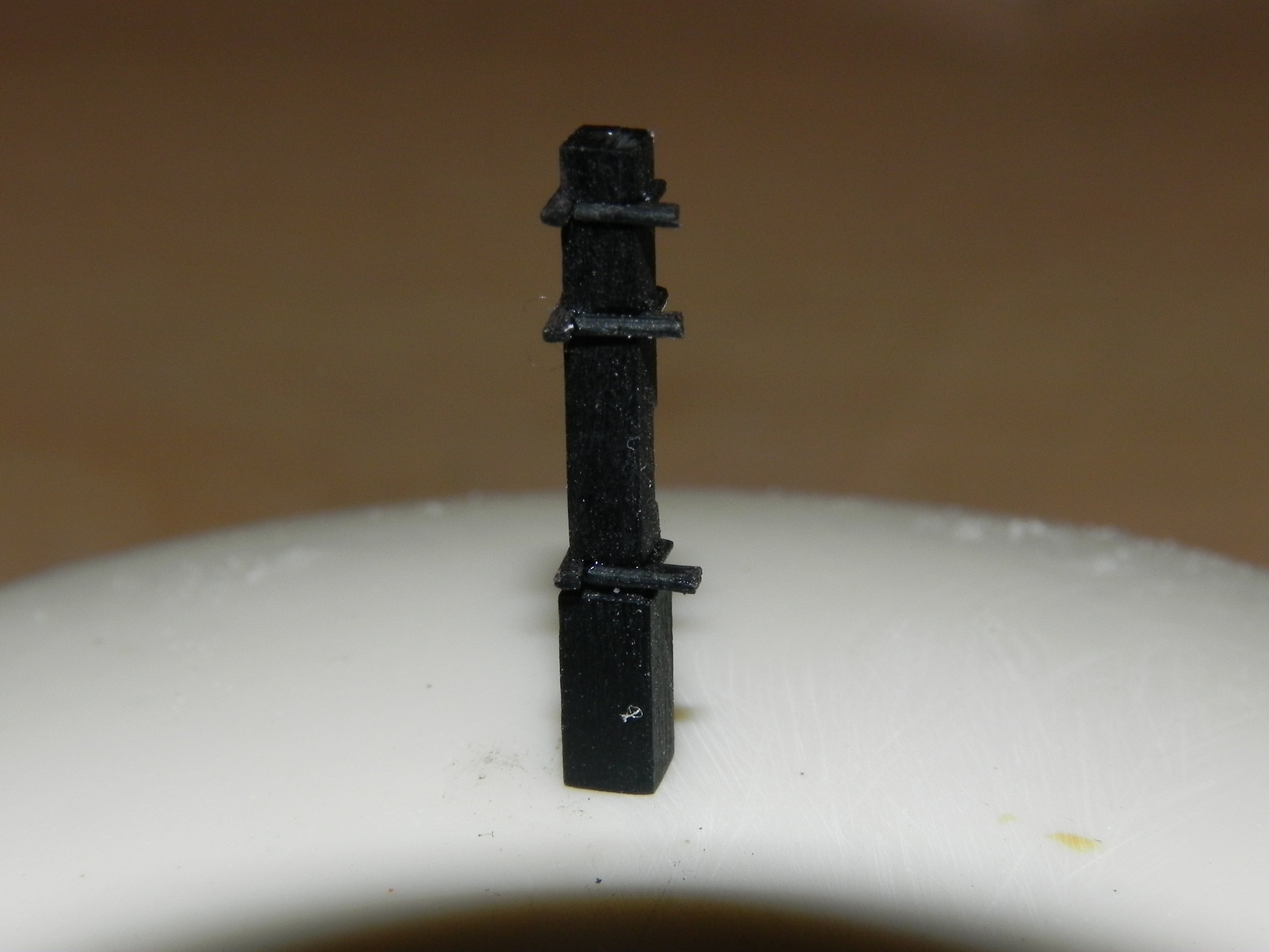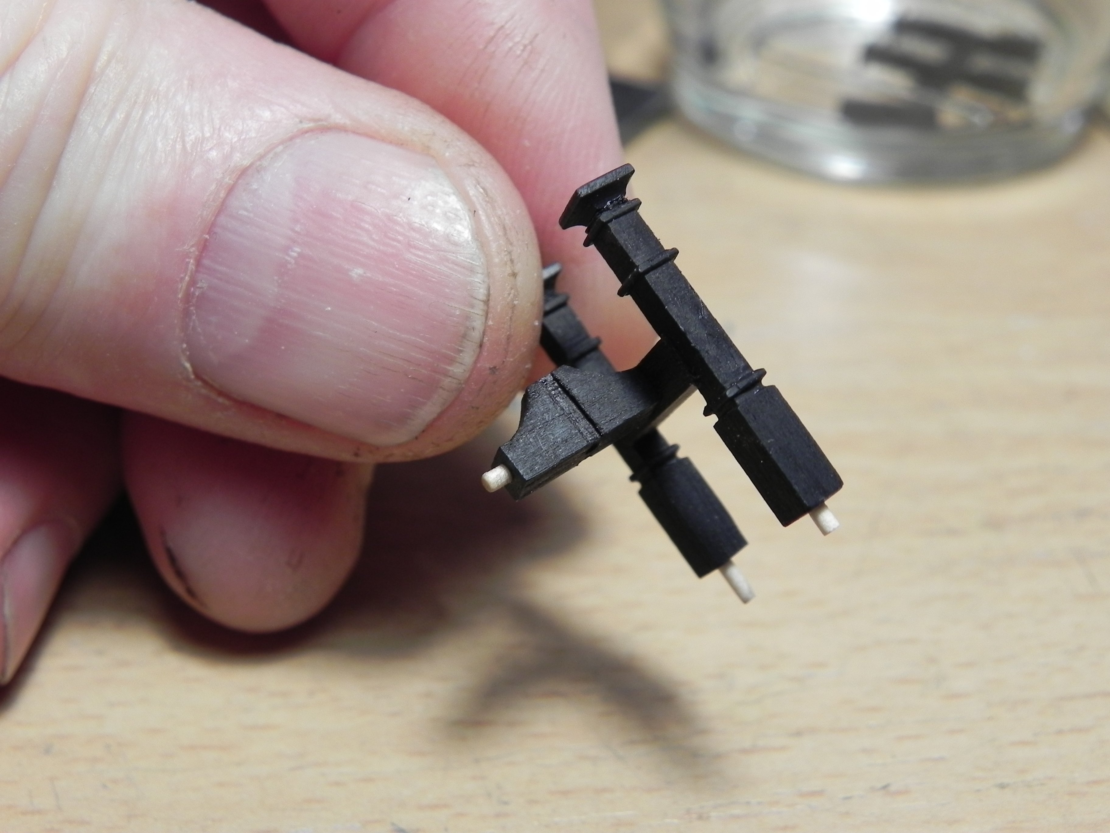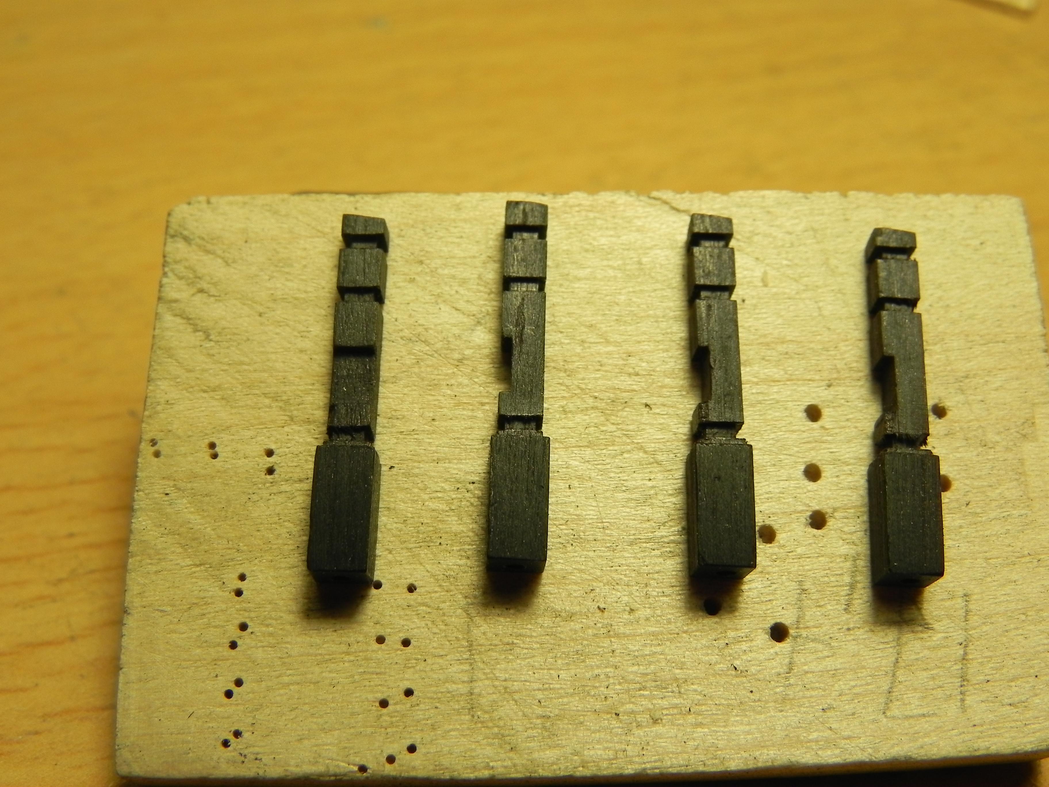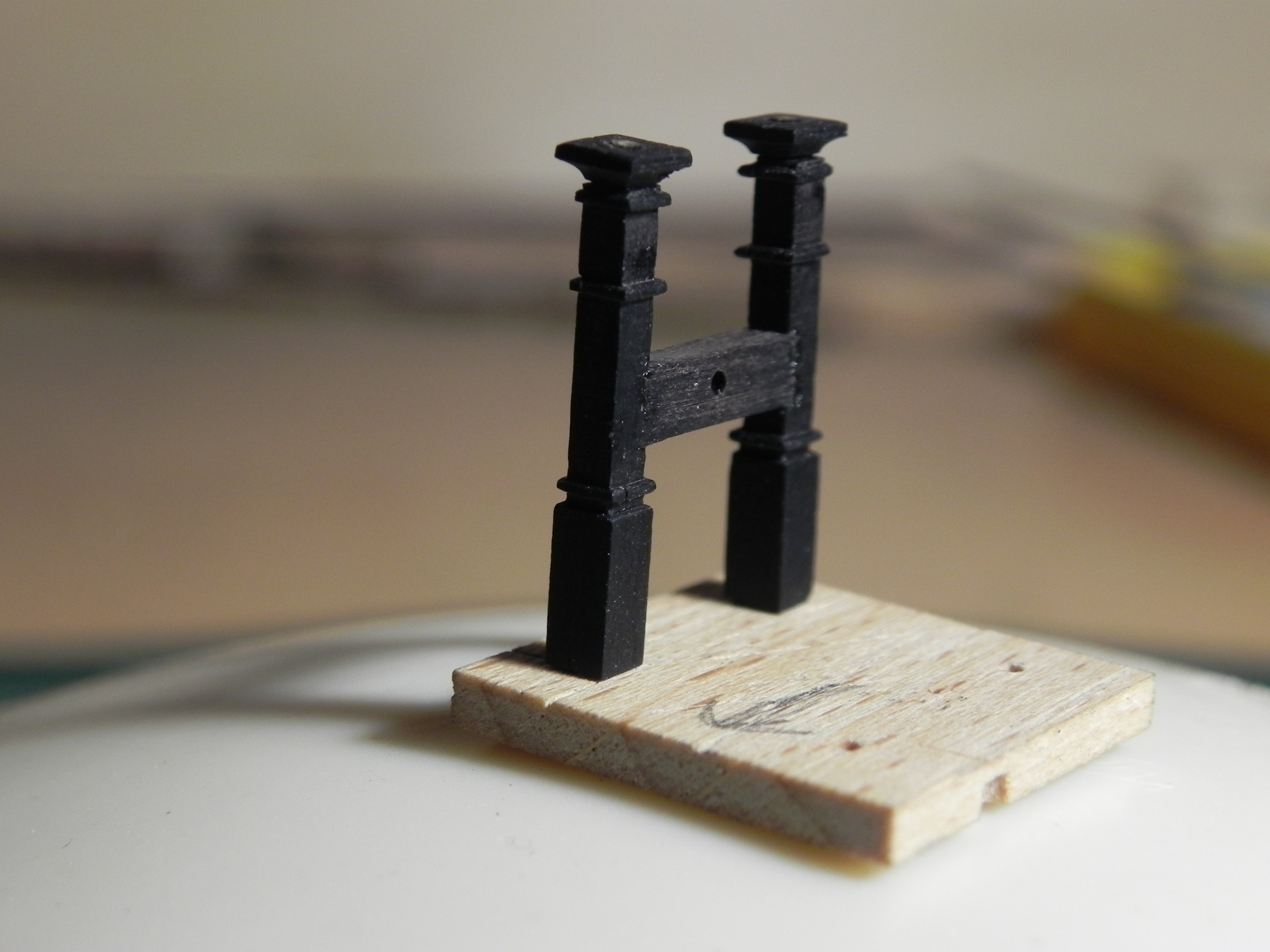 Игорь, Павел, спасибо. Коротко расскажу, как делал. Делал заготовки стоек 3х3, потом фрезами выбирал пазы. 05х05. Брал реечки 05х08 и вклеивал в пазы. Есть, конечно, тонкости. Вклеивать было сложно, пока не приноравился. Клеил на циан, титебонд на таких малых плоскостях не работает. Или может я не так клеил. Дерево черное и видно стыки очень плохо. Работал с лупой. На светлом дереве проще, но потом красить, не то.Обязательно делал штифты . Особенно посадочное место на палубу. И фиксировать детали относительно друг друга без них плохо. все разъезжается. Второй день не придумаю , как сделать металлическую вставку в противовес колоколу, сделал для этого проточку 1мм. ,а вот саму железку сделать не получается. Она должна быть шириной 1мм, да еще с отверстиями под гвоздики, да еще согнута. Думаю.