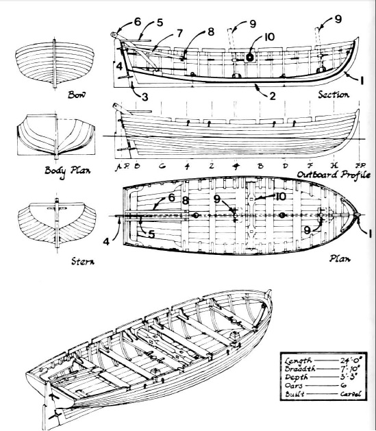 Двадцать три шпангоута, из них три – поворотные (формируют носовую часть шлюпки).