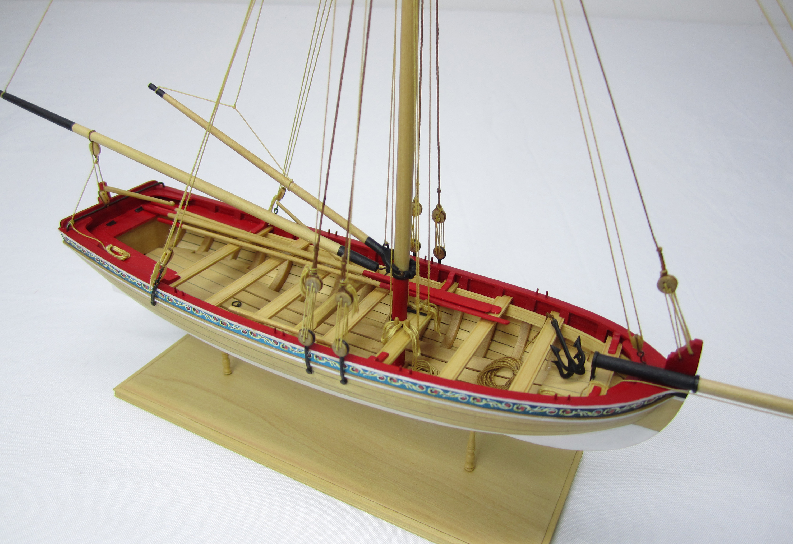 На самом деле, шпангоуты, по аналогии как на кораблях, имели составную конструкцию из флортимберсов и футоксов, соединённых в замок, но разница в ширине этих деталей, хоть и ничтожна в нашем масштабе, читается только в той части шпангоутов, которая закрыта рыбинами и кильсоном, и поэтому ей пренебрегают. Шпангоуты покрывали железным суриком. В период наполеоновских войн внутренние поверхности 31-ф барказов красили минеральной охрой, соответственно, и шпангоуты тоже. Тогда как старые 34-ф и 31-ф баркасы оставались изнутри красными - цвета железного сурика - до ремонта (если доживали, конечно: век шлюпок недолог).