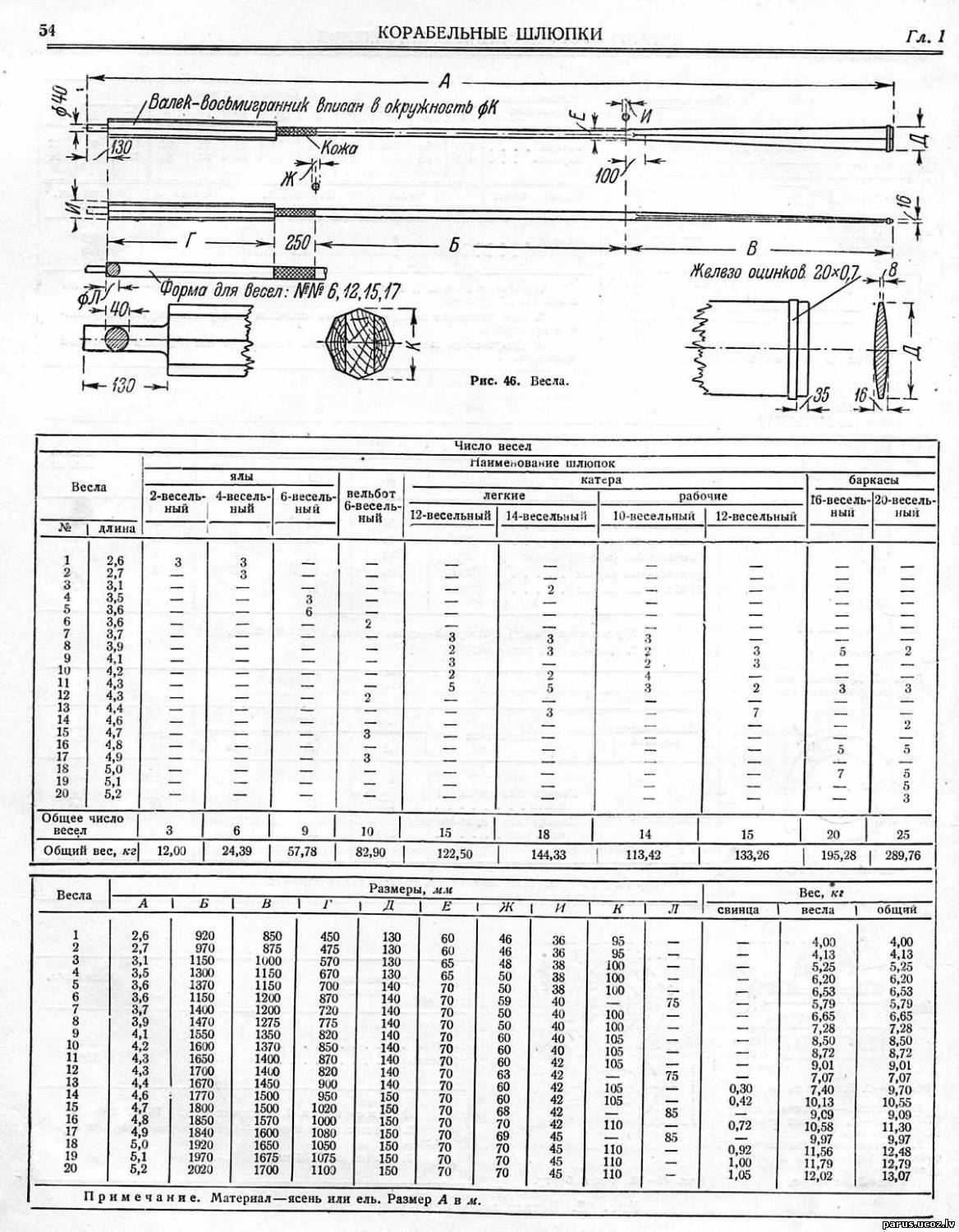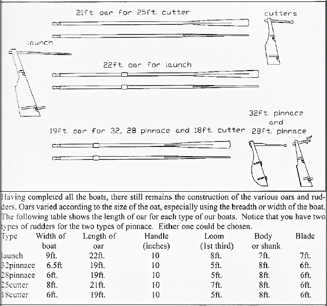 Я опускаю описание вёсел, взамен даю две универсальные таблички с указанными размерами. На протяжении 18 века вёсла красились в красный цвет, с 1800 года – в белый.