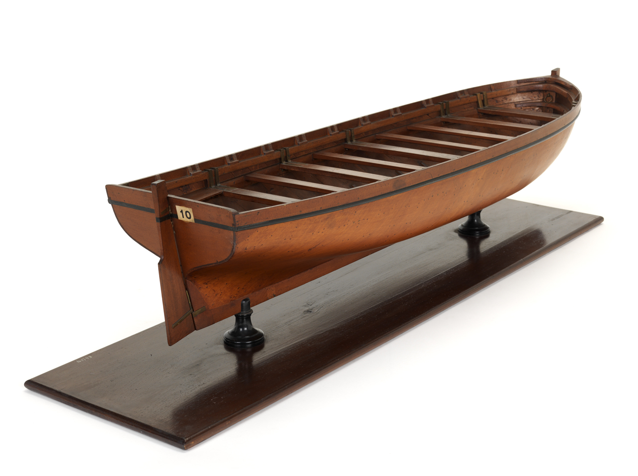 Эти доски лежат на шпангоутах и выполняют роли одновременно палубного настила и продольных силовых элементов (карленгсов) шлюпки. Именно их должна была изобразить фирма Амати для всех своих шлюпок вместо каких-то палуб. Длина рыбин может быть ограничена пайолами. Но чаще всего рыбины проходят и под пайолами. Рыбины повторяют изгиб корпуса. Между рыбинами есть небольшие зазоры для предотвращения гнили в закрытой части набора корпуса шлюпки. К окончанию периода наполеоновских войн рыбины стали более узкими, а зазоры между рыбинами – более широкими. У меня нет достаточной информации, чтобы уверенно сказать, как красились рыбины. На некоторых изображениях рыбины не покрыты никакими защитными составами, аналогично палубному настилу кораблей или банкам гребцов.