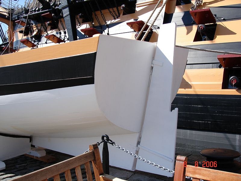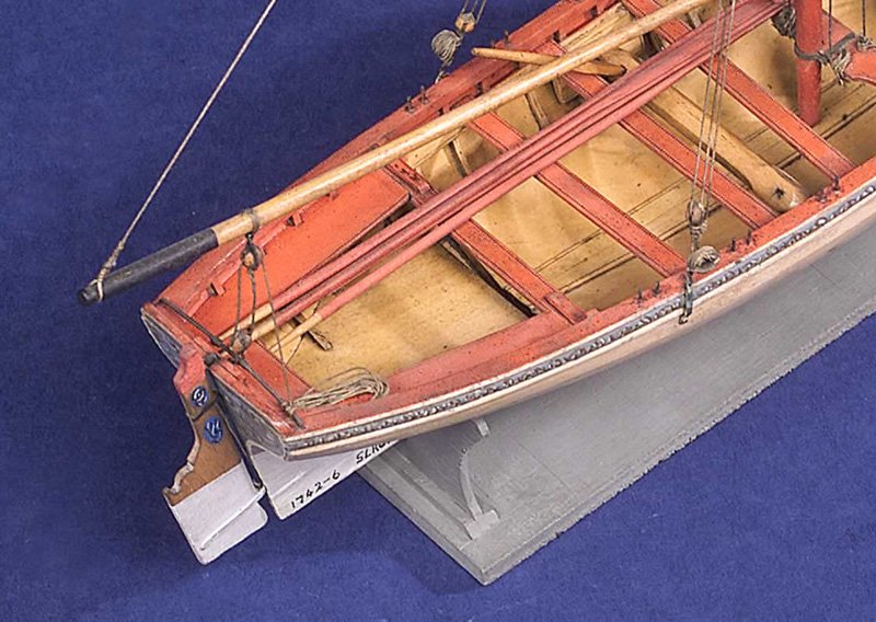 При установке любой шлюпки на кильблоки или при подвеске на шлюп-балки надо обязательно снимать руль и укладывать его внутрь шлюпки – об этом тоже очень часто забывают моделисты. Забыть снять руль – по смыслу, это такая же нелепость, как забыть снять вёсла с уключин. Руль вставляли в петли (как и вёсла в уключины) только после спуска шлюпки на воду. На корабле-музее Виктори у шлюпок все рули установлены в петли – видимо, демонстрационный вариант.