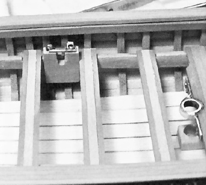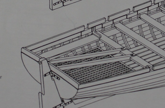 Ранее я упоминал, что по обе стороны от грузовой балки располагались две балки, выполняющие функции упоров, суппорты, соединяющие транец и последнюю гребную банку. Эти упоры были несъёмные. Когда будете делать модель, проверьте: суппорты должны выступать над бортами при виде сбоку, и должны лежать на транце. Просто, у суппортов было ещё одно, редко применяемое, назначение.