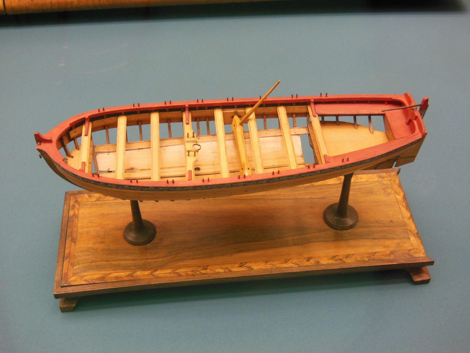 В адмиральском/капитанском исполнении внутренние поверхности бортов барки были обшиты тщательно подогнанными панелями, и поэтому шпангоуты, привальный брус, кильсон и рыбины не были заметны. То есть, конструктивно модель капитанской барки выполнить проще, чем модель шлюпки с видимыми перечисленными элементами. Надо сделать корпус методом скорлупы, наконец-то не заботясь о потёках клея на внутренней поверхности обшивки, с использованием произвольных шпангоутов или вообще без них, поставить кильсон и подлегарсы (они слегка выступают), разметить положение банок и положить внутреннюю обшивку («панели»), а так же «полик», про особенность которого будет сказано ниже.