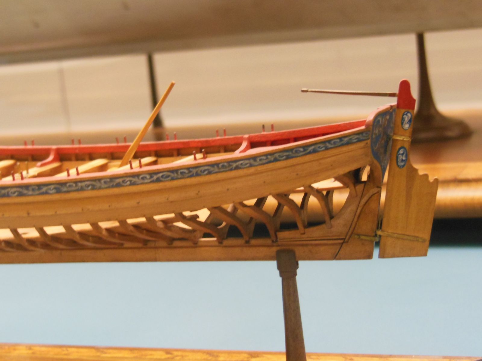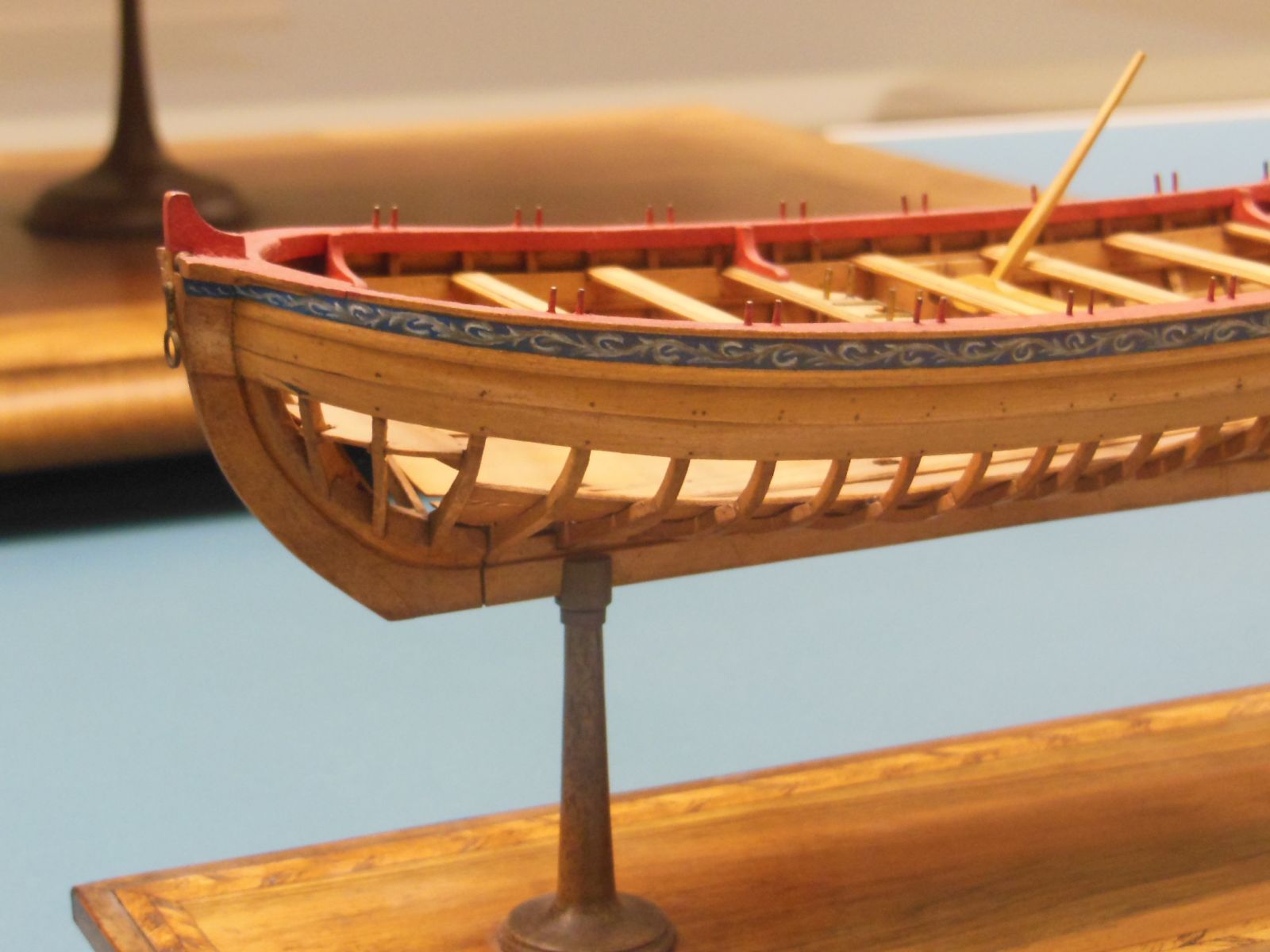 Этот внутренний фриз – ответная деталь декоративному ширстреку, проходящему снаружи борта. Панели внутреннего фриза имели оформление в виде секций «филёнки». Каждая секция была длиной «от банки до банки». Кстати, расстояние между банками на адмиральской/капитанской барке было одинаковым.