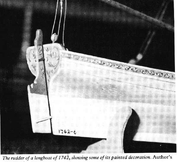Окраска рулей имеет особенность. Руль как бы делился на две части: нижний участок, от пяты до транца, и верхний участок, ответный транцу. Нижняя часть красится белилами, верхняя – в основной цвет транца. Здесь же могут быть изображены различного рода завитки в одном стиле с росписью транца.