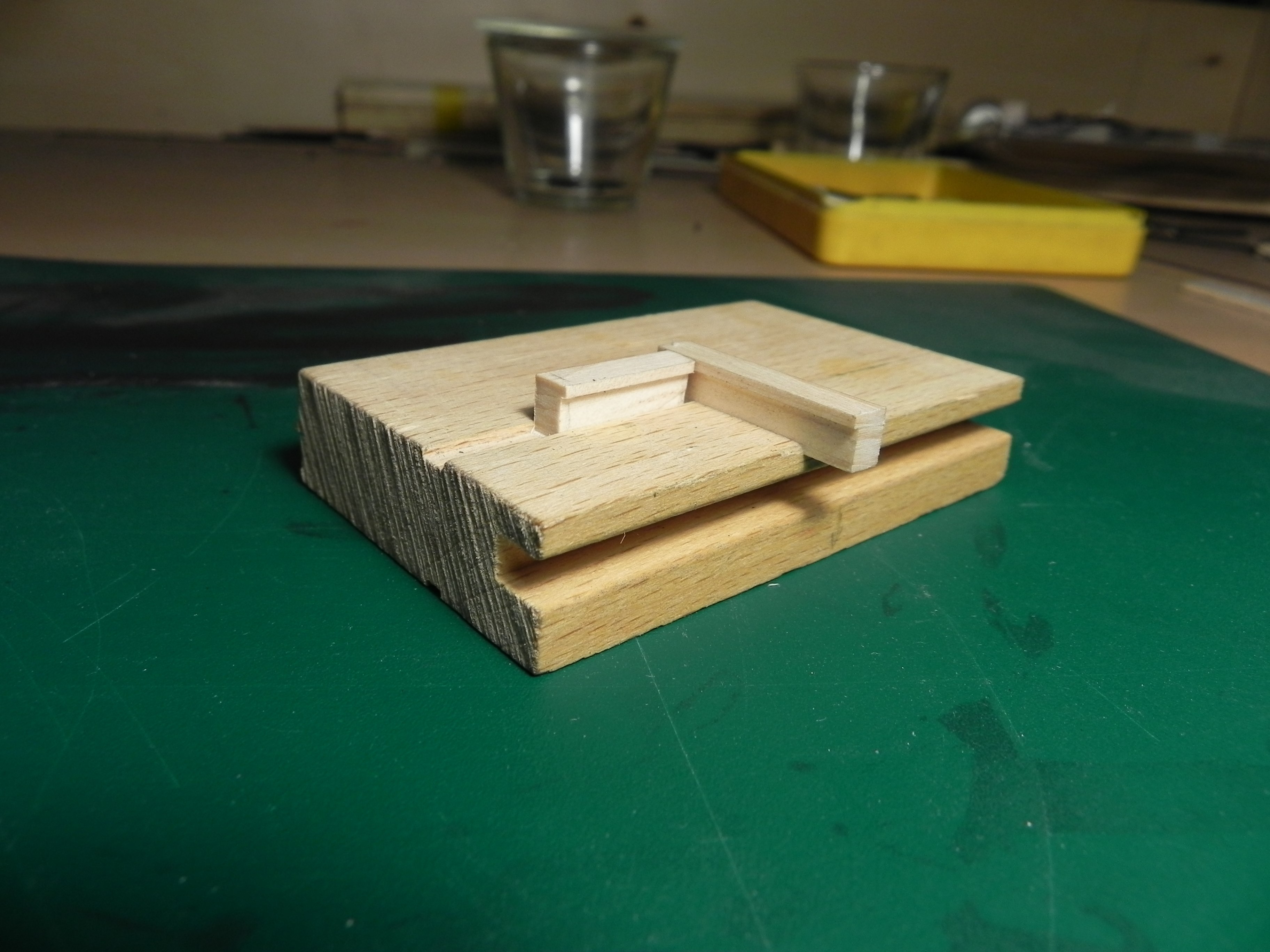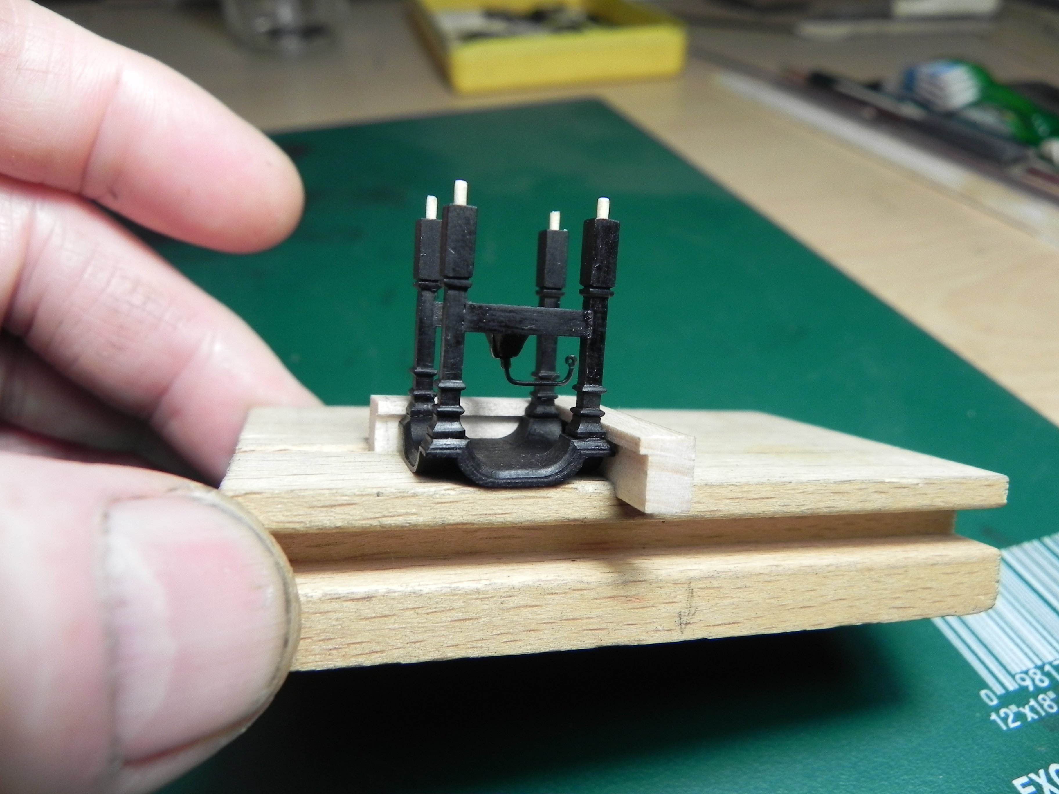 Доброе утро. Игорь, выше есть фото, где верхние конусные части стоек приклеены к четырем углам крыши. Эти конусные части с посадочными отверстиями. Вот эти отверстия и есть основа для позиционирования стоек. Встал вопрос точности приклеивания этих конусов к крыше. Сделал простую приспособу .Два брусочка сходятся под прямым углом. Ставим перевернутую крышу углом в место схождения брусочков , и туда же ставим конусную детальку, она упирается в брусочки и становится точно по месту. Но поскольку крыша имеет скошенный рисунок, то пришлось у брусочков сделать выемку( глубина выемки делается визуально). После приклейки конусов перенес размер четырех отверстий на пластину-основу. Получается пластина-основа , над ней крыша с конусами и с отверстиями , зеркально расположенными отверстиями в пластине -основе. Ведь в стойках тоже есть отверстия по центру. Сажаем все на штифты и готово. Честно сказать я ничего не понял, что написал. Все фото наоборот. И где перевернутая колокольня, должна быть просто крыша. Фото такого нет и я для наглядности поставил колокольню.