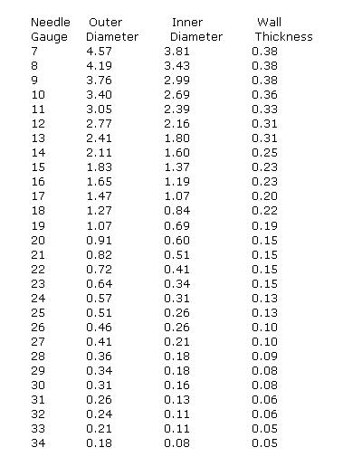 Вот табличка с маркировкой, внутренними и внешними диаметрами медицинских игл:Kazak писал(а):Миша, в аптеке иглы медицинские от 0,1 мм до !.5 мм с шагом 0,1 мм без проблем.