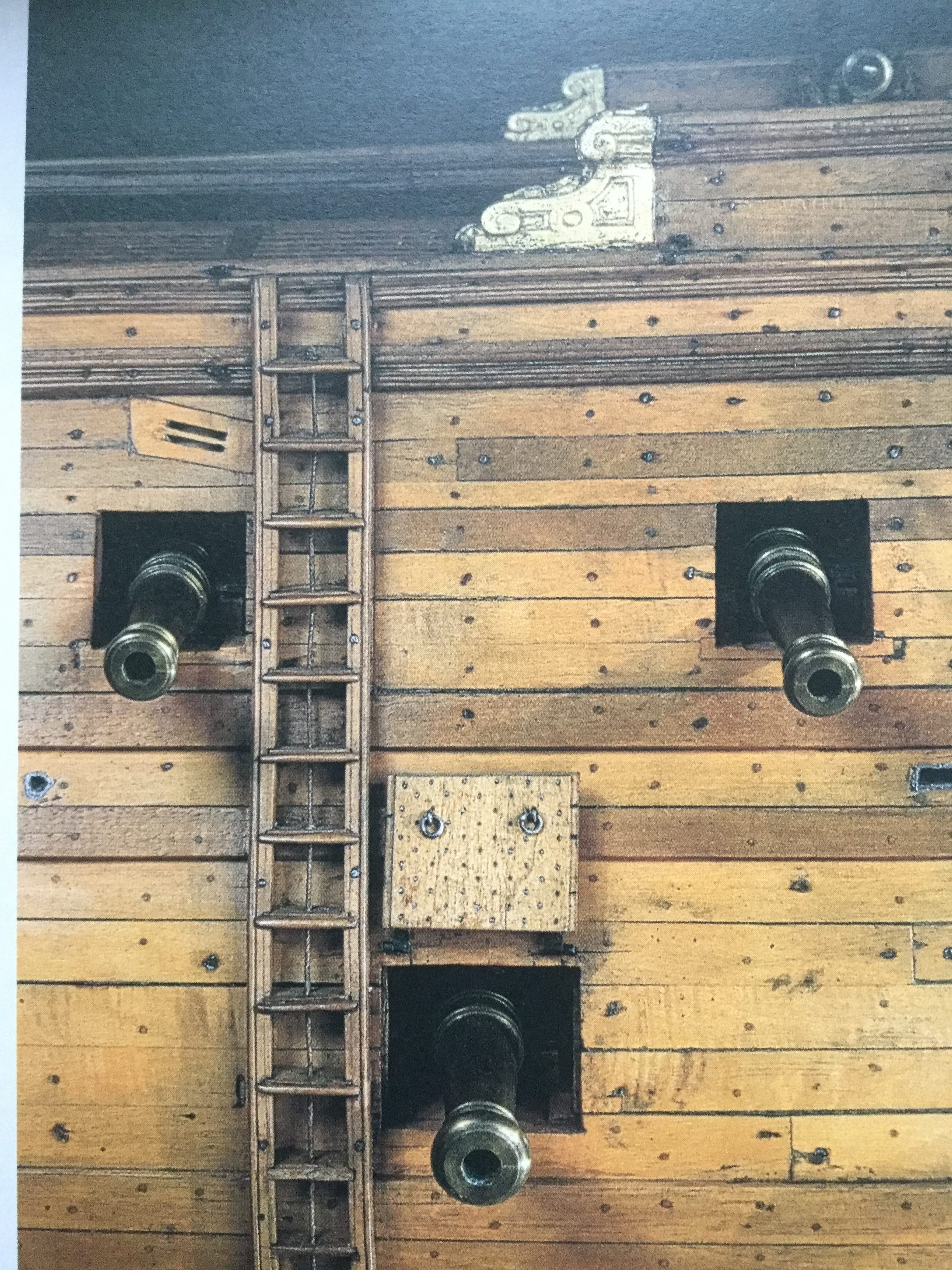 Я вас поправлю немного. Никакого смысла лезть через пушечные порты не было. Может, и есть какие-то дикие истории из популярных книжек начала века про корсаров, пиратов и прочей ерунды, но... Забортного трапа вполне хватало, чтобы личный состав попал на корабль на каждую палубу, куда ведут ступени, без акробатических этюдов, а вполне по-человечески, даже при условии пресловутой армейской скорости и "подгонялова". Что касается высших чинов, то для них спускался специальный складной забортный трап, который на английских моделях 18 века мы практически никогда не встретим.