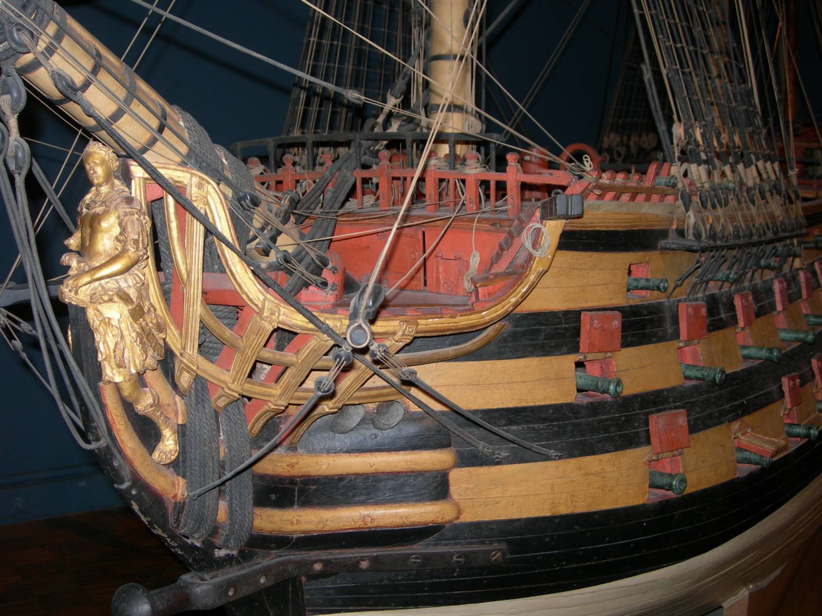"Четвертей" нет. Это не новоделы, это всё модели кораблей проекта Санэ для Адмиралтейств-коллегии. Вторая половина 18 века. А вот "француз" самого начала 18 века, Тоже масштаб огромный. Модель из морской школы Бреста. Крышки - без четверти. Ну, для "закрепления материала", посмотрим уж совсем отстающих в 18 веке голландцев: