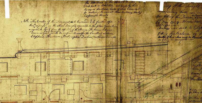 Я думаю, что господин Франклин делал свою модель на основе вот этого чертежа, подписанного Слейдом. Хорошо видно, что пунктирными линиями, за печкой камбуза, указаны переборки каюты боцмана. Их расположение не совпадает с бимсами. Третий с кормы бимс палубы бака "навис" над третьим пушечным портом, хотя в модели Слейда это уже не так: бимс подвинулся вперёд, расположился напротив того шпангоута, бок которого является стенкой для пушечного порта, а верхушка стала третьм с кормы топтимберсом. Возможно, по ходу проектирования, Слейд вносил изменения в конструкцию. Даже на этом чертеже видны "исправления".