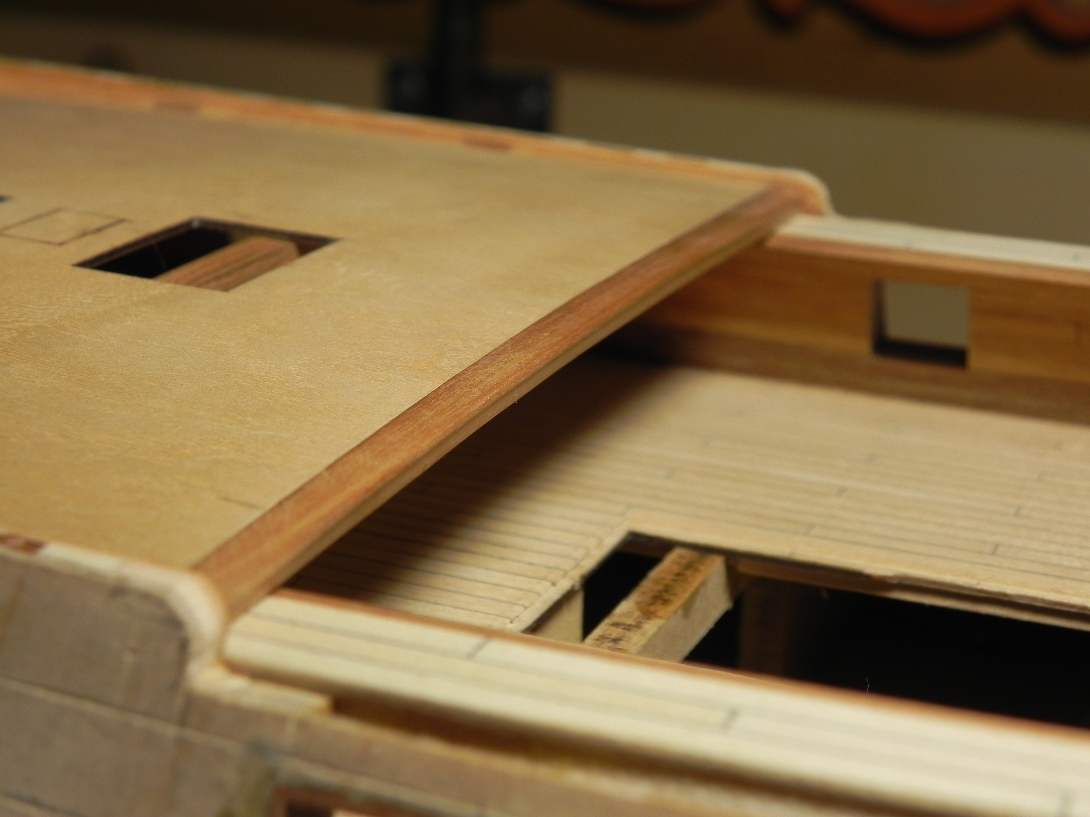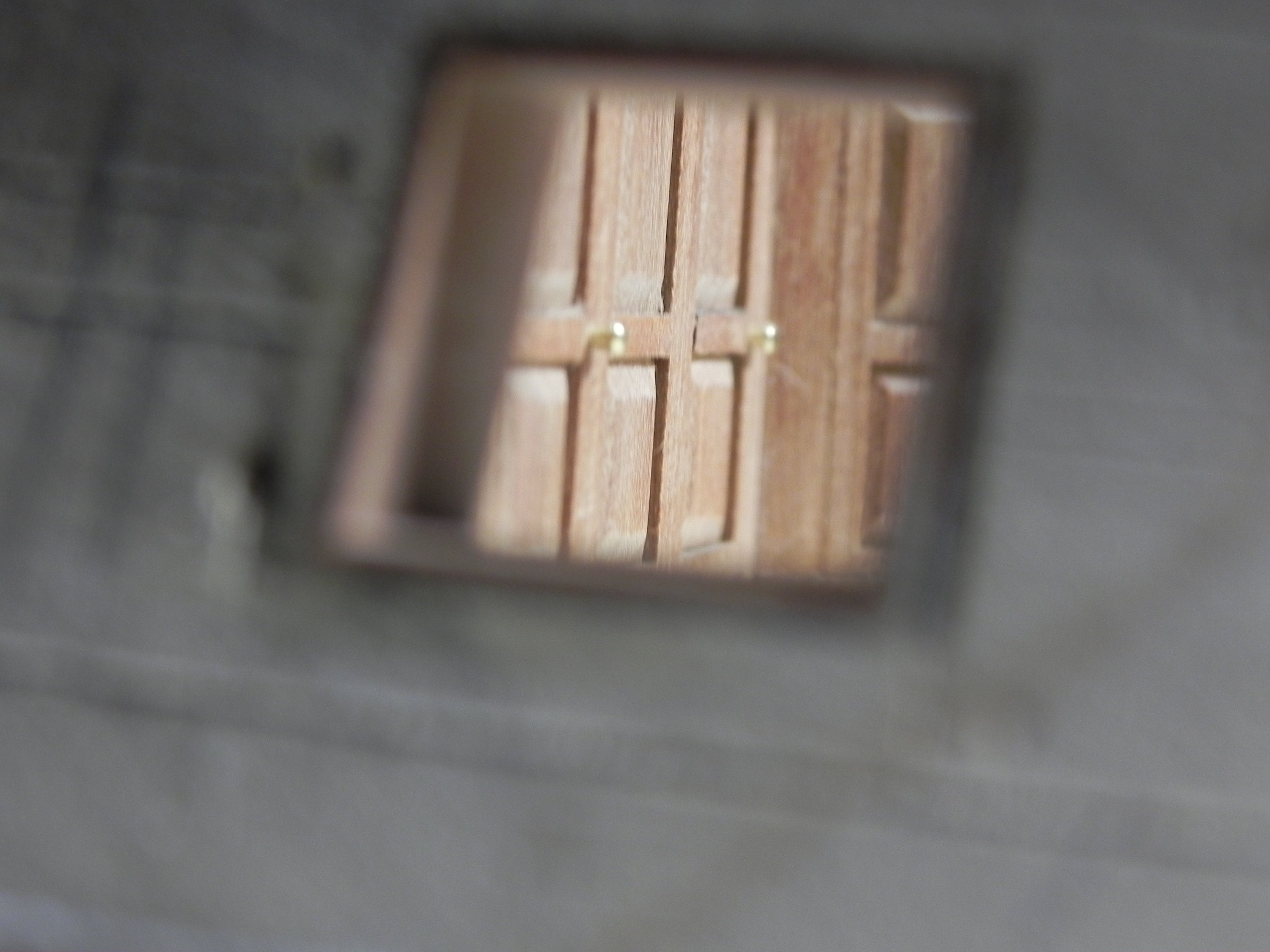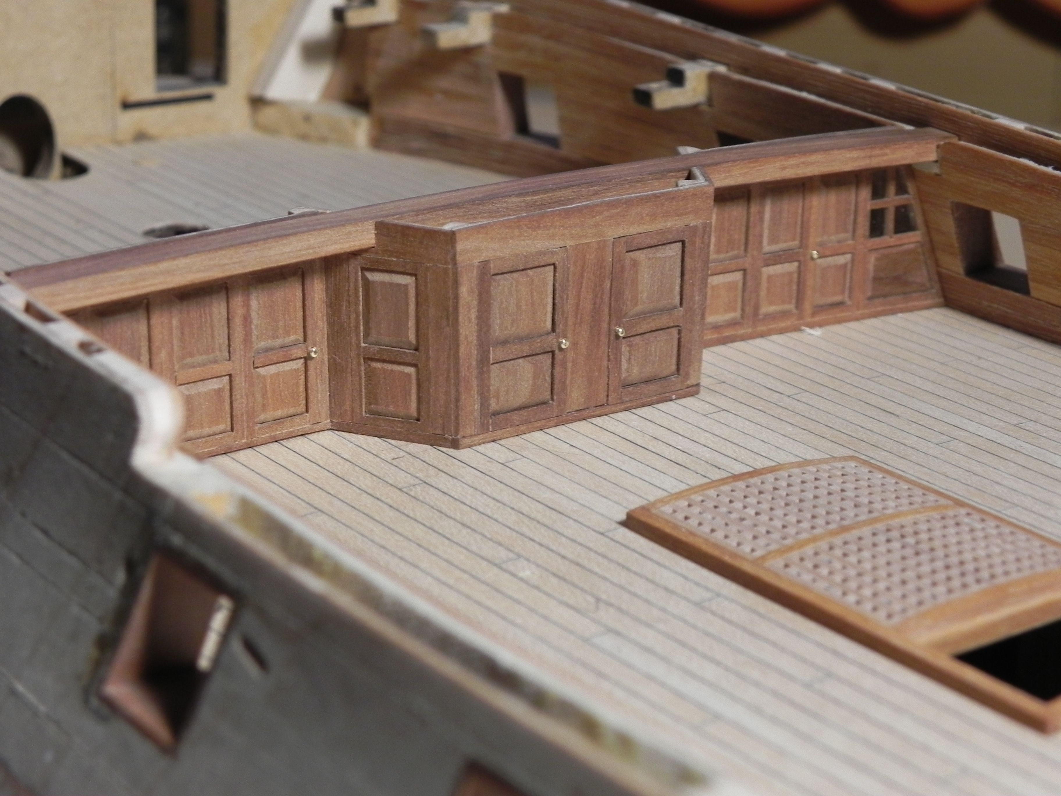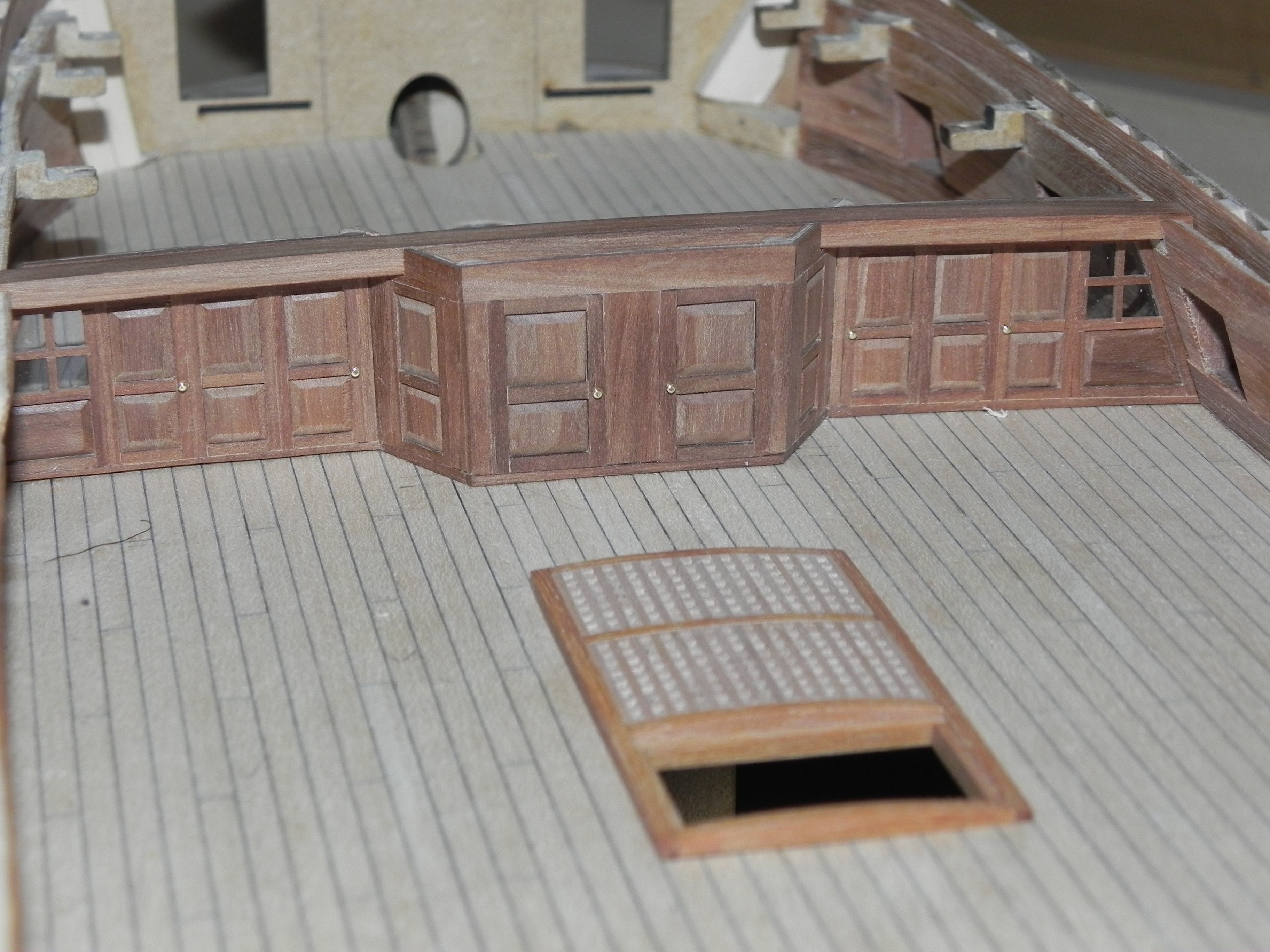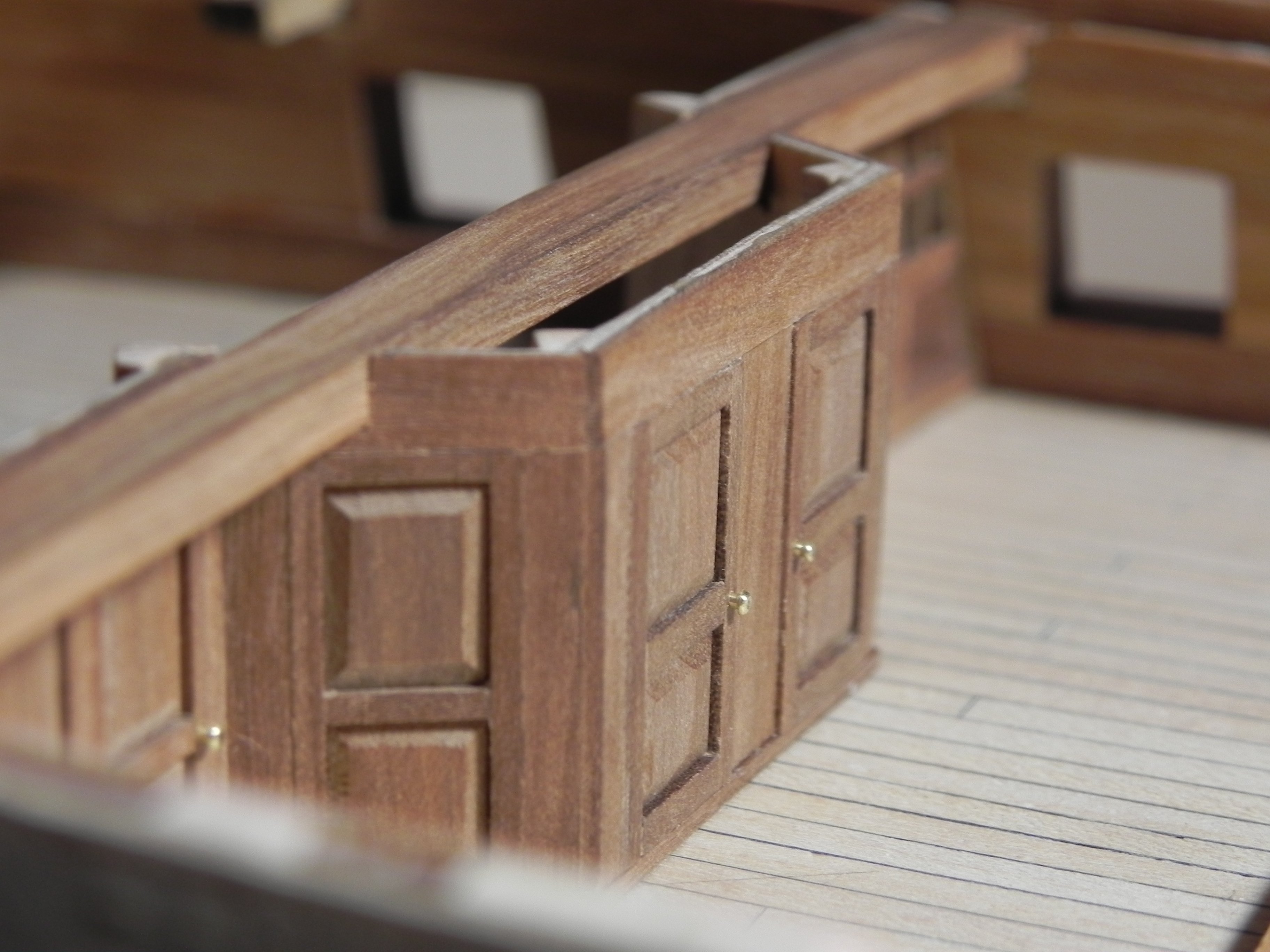 Ну, как делать двери... да у вас сейчас самое интересное! Конечно, только методом аппликации. Нарисуйте все перемычки, филёнку и прочее карандашом. Нарезайте тонкий шпон и не спеша, выклеиваете. В вашем масштабе 0,5 шпон - идеально подходит. Окна, конечно, так как их заметно через пушечные порты, надо делать по-полной.