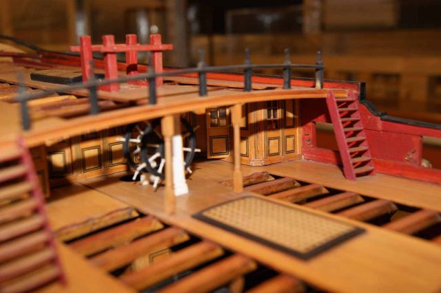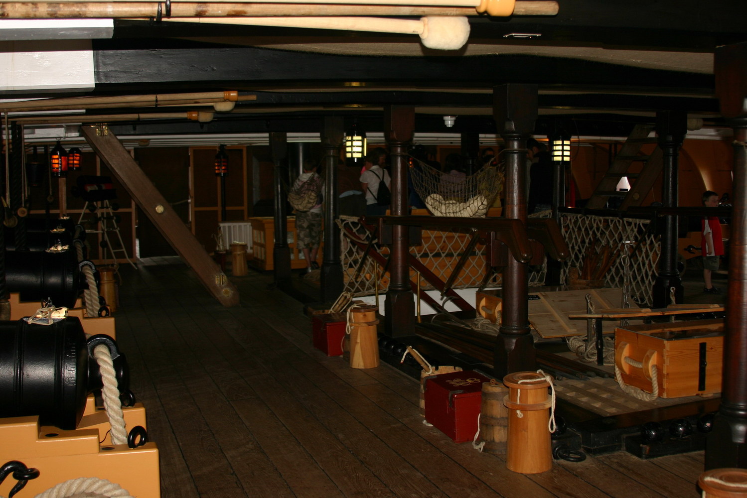 Кстати, посмотрите на подобную переборку, выполненная на Виктори. Что интересно, переборка на фото корабля-музея сильно отличается от того, что показал Слейд на своём проекте Виктори. У Слейда в носу классические каюты боцмана и плотника, но нет камбуза (он палубой ниже), переборка между каютами демонтирована. На корабле-музее наоборот: переборка есть, кают нет, но лазарет на месте.