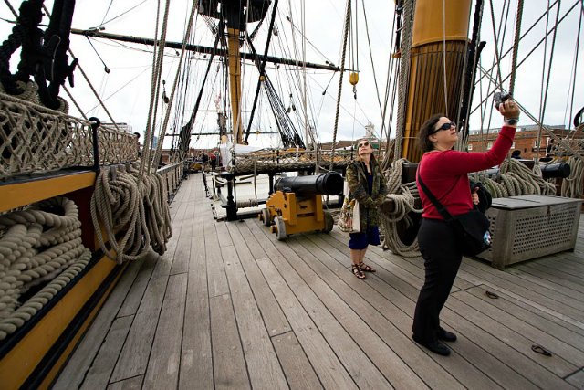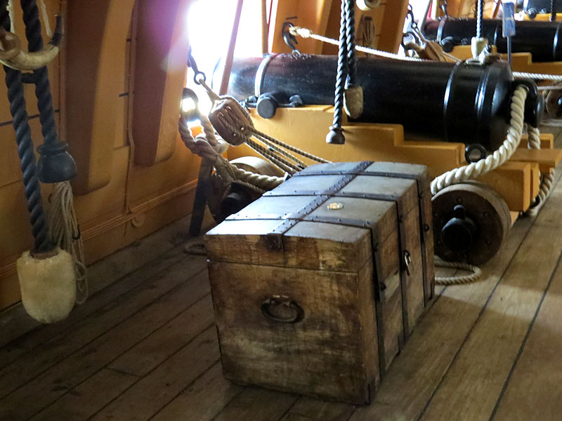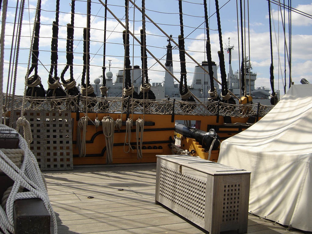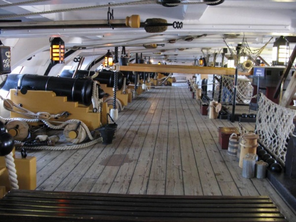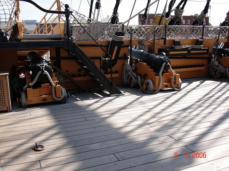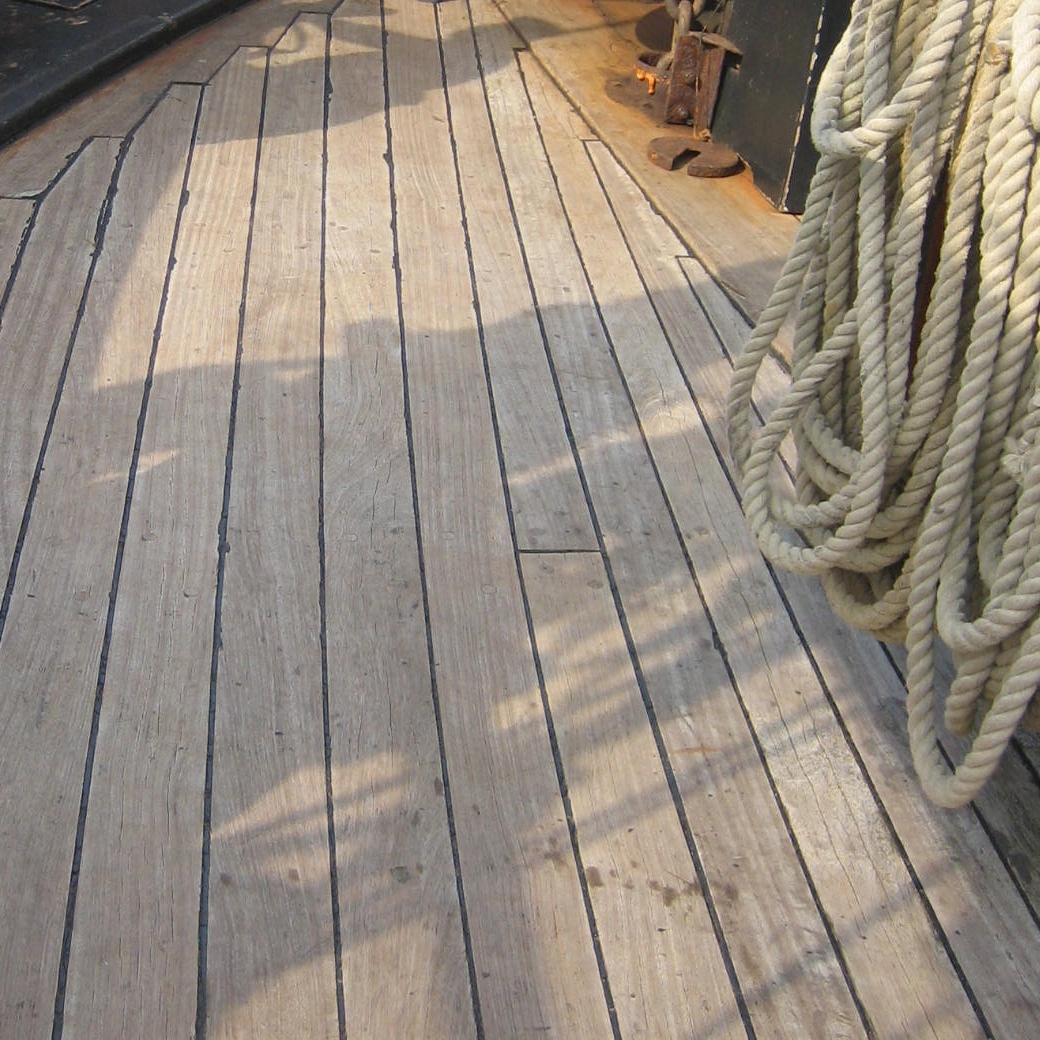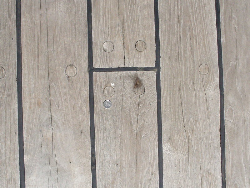 Выбеленные драинием палубные доски надстроек Виктори. На нижних палубах доски не нуждаются в постоянном смачивании, поэтому смола в них до сих пор сохранилась, и они тёмные, красноватых оттенков. На палубную доску шли хвойные породы деревьев. Доски палуб всегда сужались по форме бортов. Доски были как можно более длинными. Стыки всегда приходились на бимсы. В отличии от французских палуб, на английских палубах карлингсы были сделаны заподлицо с бимсами, и прикрывались сверху досками. Поэтому выделять карлингсы другим цветом, как часто делают "французостроители", нет смысла. Да, форму и раскладку досок можно подсмотреть у того же Димы Шевелёва, плотницкое дело схоже практически во всех странах, но все доски должны быть одного цвета. Правило стыков "через две, три доски" - это всего лишь рекомендация, реально его лишь придерживались, а доски раскладывали согласно здравому смыслу, стараясь не допустить "коротышей". Например, раскладка досок квартердека Виктори имеет способы и "через две", и даже "через одну", при этом, ещё и не симметрично - относительно бортов!