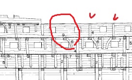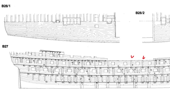Нельзя не упомянуть необычную врезку палубных досок в зубовый пояс на ахтердеке Виктори. Вместо привычных "замков" здесь врезка напоминает "зазубрины", характерные для врезки в носовой части. В остальном всё, как обычно: длинные сужающиеся доски, мало стыков, а сами стыки не соблюдают правил, о которых мы читали у Монфельда, Хоккеля и проч.
