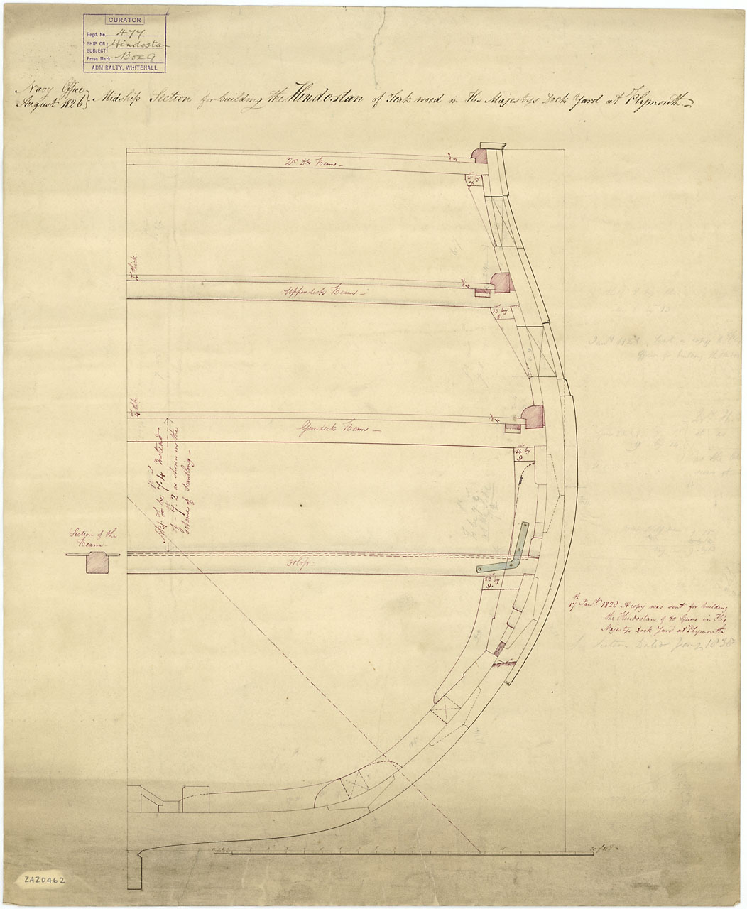 Исторический чертёж из Гринвича. "Индостан" - один из последних 74х-пушечников, в генах которого ещё оставалось что-то от проекта Слейда. Интересны ватервейс и данные на толщину палубного настила на каждой палубе.