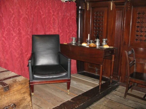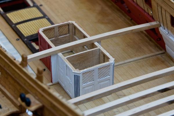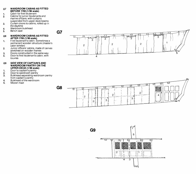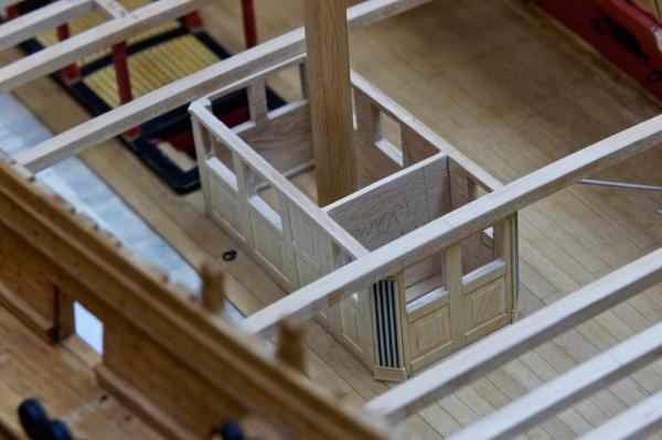 С4, позиции 9 и 10. Это капитанская кают-компания и кладовая. Стенки этой каюты такие же, как вы делали в носовой части, но изящнее, а на дверях вместо окон - жалюзи. Судя по фото некоторых кораблей, эти каюты темного дерева, лакированы. Они тоже съёмные и имеют комингс. Но разбирались они, логично, только в крайнем случае - перед боем, тогда как расположенные здесь же, побортно, переборки кают офицеров, полотняные, в жаркую погоду проветривались скатыванием "дверей" в рулон вверх. Вид сбоку, G9: Так же под палубой квартердека всегда виден грот-гардель-шпиль. Его видно так же через трап за грот-мачтой с палубы квартердека. А капитанская кают-компания видна через "свёрнутые вверх" дверцы полотняных переборок.