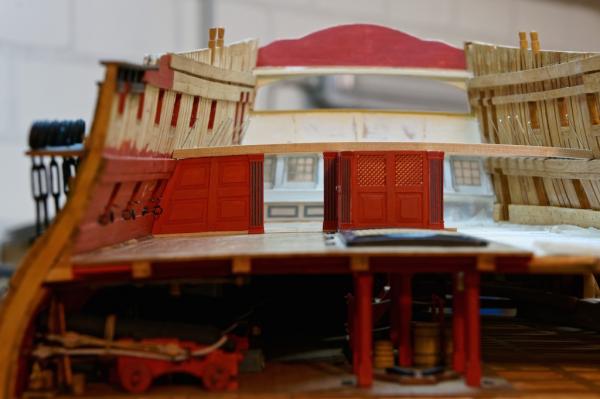 Дело в том, что, при наличии переборок, пушки нельзя установить, когда вы разместили палубу квартердека. Пушки же ставят на последних этапах изготовления корпуса, чтобы не свернуть случайно стволы. Начинающие моделисты "тянут до последнего", и, когда палубы надстроек уже поставлены, вдруг выясняется, что туда, под надстройки, неудобно "закатить" орудия. Ну, изловчившись, протягивают пушки при помощи ниточки. Бывалые моделисты ставят только станки, еще до установки палуб надстройки и переборок, а стволы аккуратно приклеивают позже, когда корпус уже сделан, через пушечные порты. Потом на стволы пинцетом или тонкой палочкой с пластилином на кончике ставят замки на цапфы на момент-гель - он долго сохнет, позволяет поправлять деталь. Но у вас масштаб маленький, тут скобы на цапфы придётся клеить заранее. У кого-то скобы замков цапф вообще рабочие, у кого-то стволы уже стоят изначально, невзирая на опасность сломать, кто-то стволы делает деревянными, составными, красит и тонирует под металл, и в конце сборки модели приклеивает дульную часть ствола к казённой, оставшейся на станке, не заморачиваясь... Вариантов куча, кто на что горазд. Я, но это сугубо личное ИМХО, делаю так: сначала собираю пушку "насухо", то есть, не приклеиваю ствол к станку, примеряю орудие к порту. Если всё в порядке, приклеиваю хомуты на цапфы ствола так, чтобы эти самые хомуты лежали на станке правильно. Но к станку их не клею. Потом я ставлю на модель станки без стволов, а стволы вставляю через пушечные порты в конце сборки, когда уже даже крышки портов установлены. Чтобы не возникло внезапно несовпадение хомутов на станке, у меня все станки и стволы заранее "подписаны" - хотя... обычно, они все одинаковые.