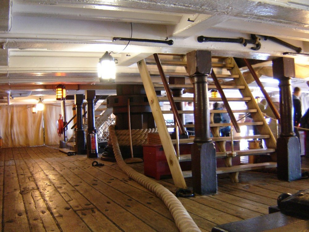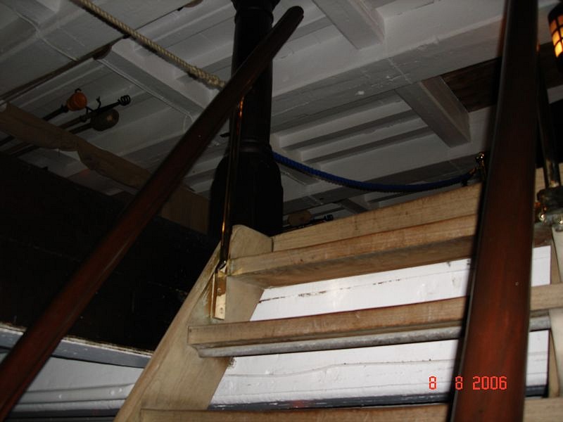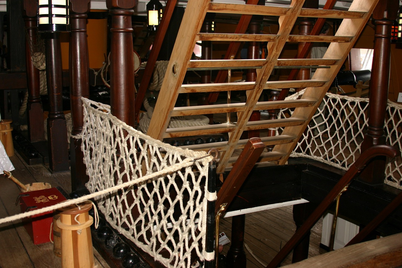 Я уточню: верёвочные перила, конечно, были - на трапах, расположенных сбоку - со шкафута на опердек и с бака на опердек, а так же (возможно, но не факт!) на трапах с квартердека на ют. Я подметил эту деталь на Виктори - все трапы с леерами расположены по бортам. Во всяком случае, модели об этом молчат, а на Виктори там верёвочные леера. На всех других трапах, расположенных по оси палуб, на Виктори деревянные перила. Видимо, это связано с количеством людей, пользующихся этими трапами.