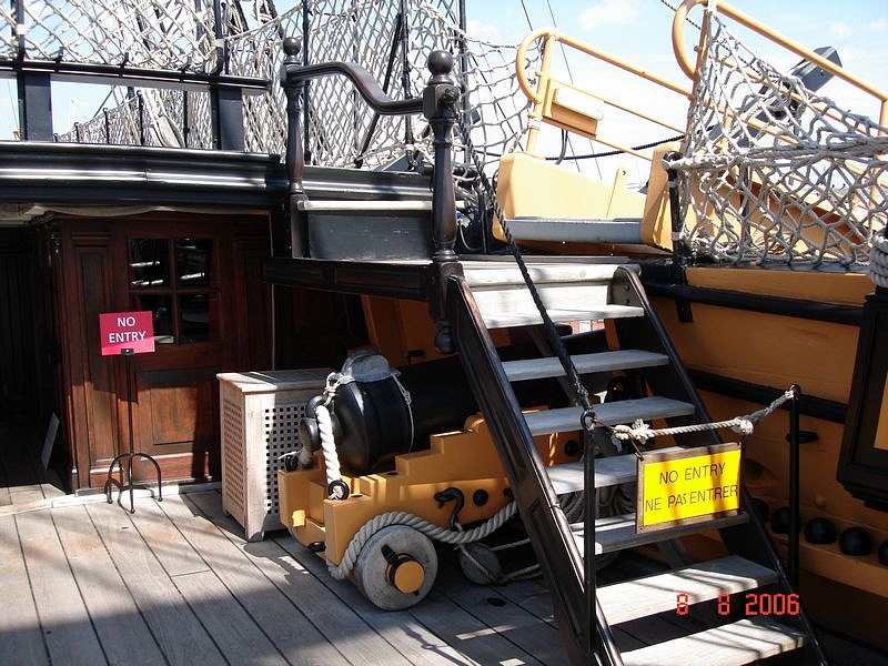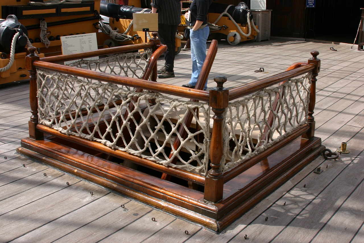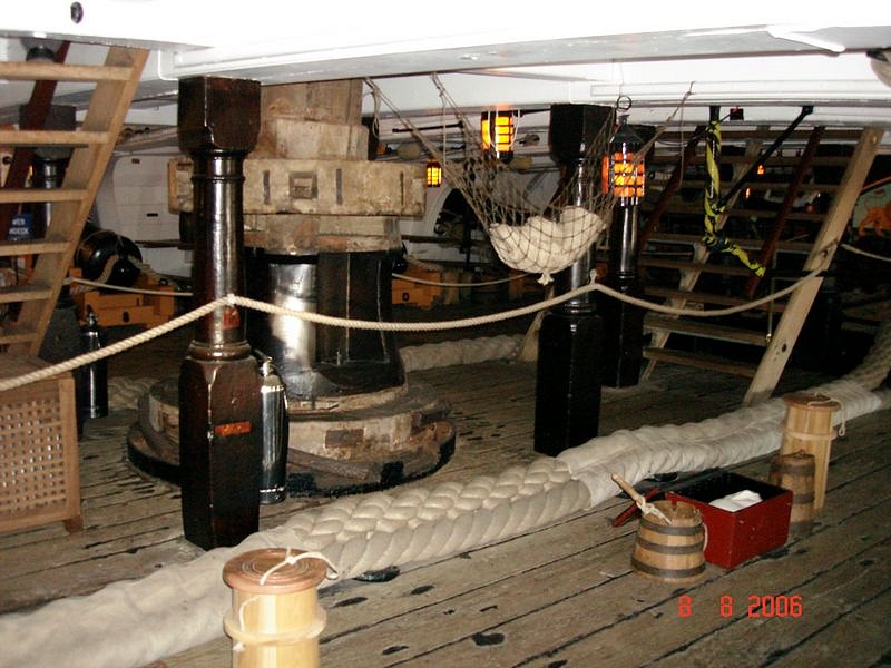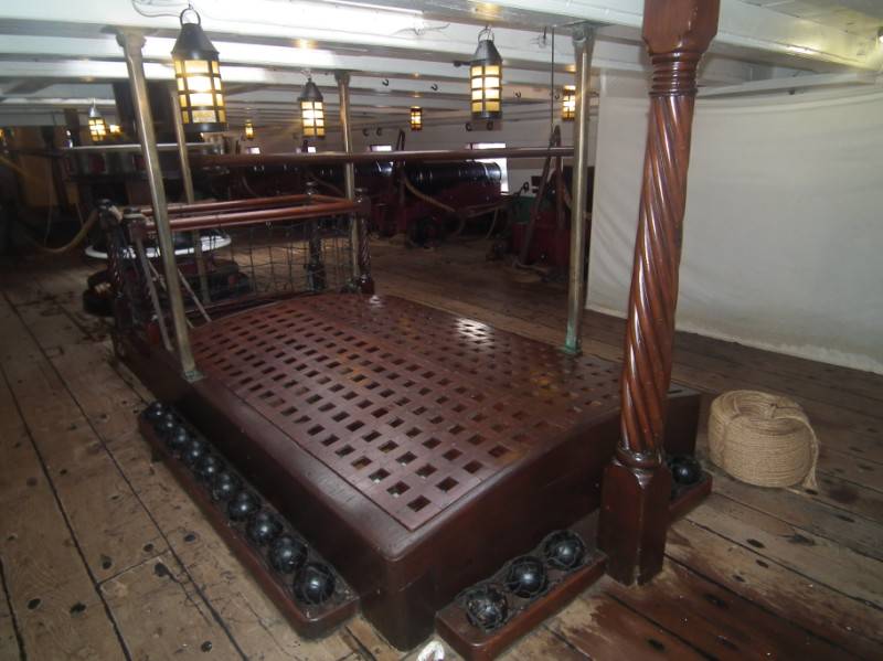 Фото сетки именно "квадратиками" я не нашёл сейчас, вот фото чисто понять, о чём я говорю: Трап. Релинг трапа на квартердеке, тот, что сразу за грот-мачтой, будет именно такой, как вы показали на фото Виктори. На различных моделях общий принцип виден хорошо, разница обычно только в цвете раскрасски пилерсов (стоек) . Вот разные фотки: На опердеке - малый трап перед фок-гардель-шпилем и большой трап перед грот-мачтой. Вы, конечно, заметили на фотографиях моделей из музея, что там нет релингов и поручней. А всё потому, что пилерсы (стойки) были съёмными, в том числе и их простые перила. Эти трапы и их ограждения снимались на время погрузочно-разгрузочных работ, то есть, часто. На Виктори заметны бронзовые петли, на которые вешались эти трапы. Вы можете сделать пилерсы по аналогии с теми, что сделаете для трапа на квартердеке, но гораздо проще по внешнему виду (не для офицеров эти трапы!) и "воткнуть" их в углы комингсов люка. Вот фото с Виктори: В заключение хочу сказать, что вариант с леерами вместо перил, как показывает Амати, некрасив и мало вероятен для корабля 3 ранга с экипажем 650 человек и 200 человек морской пехоты... Перила Виктори наиболее правдоподобны.
