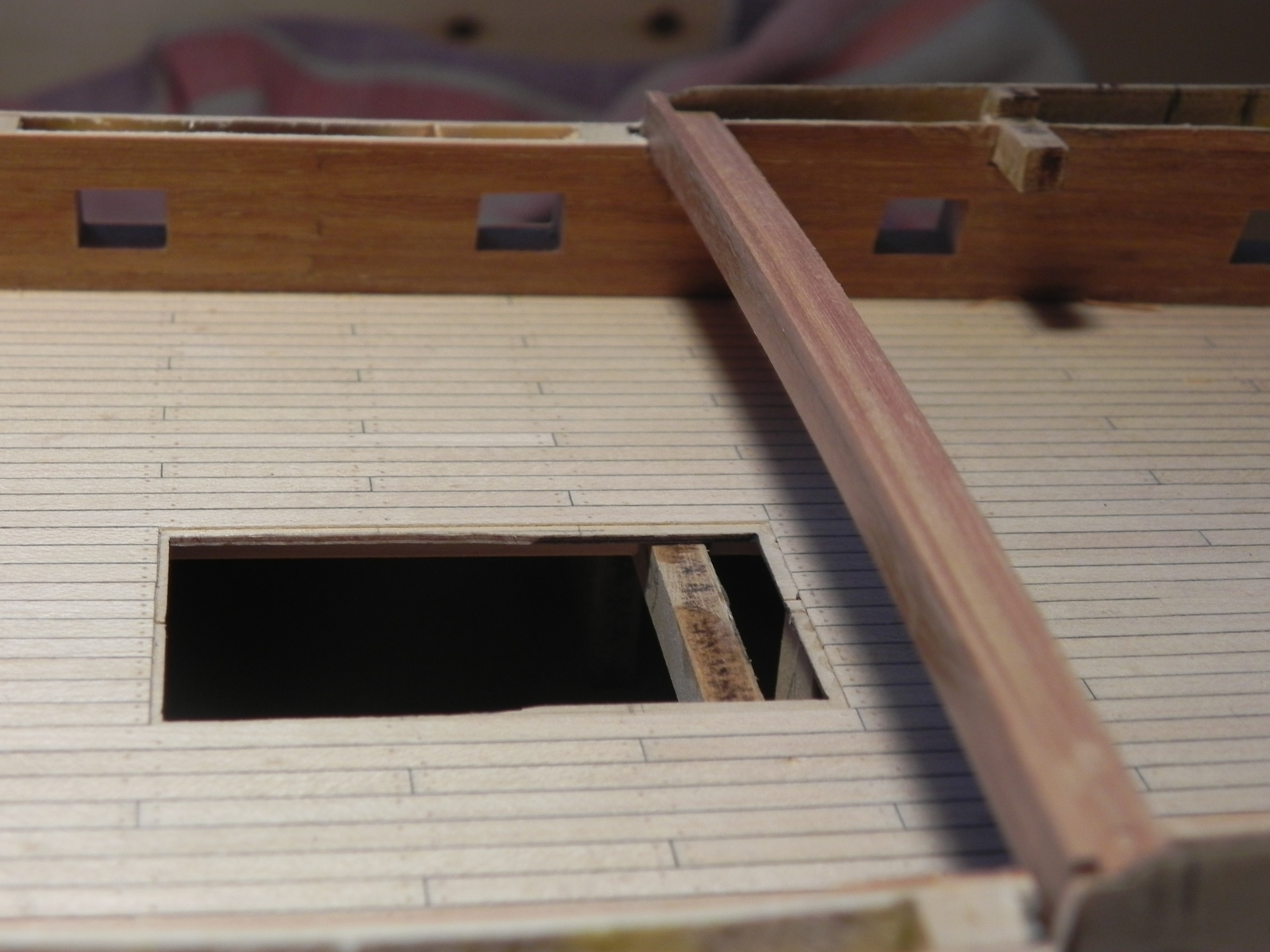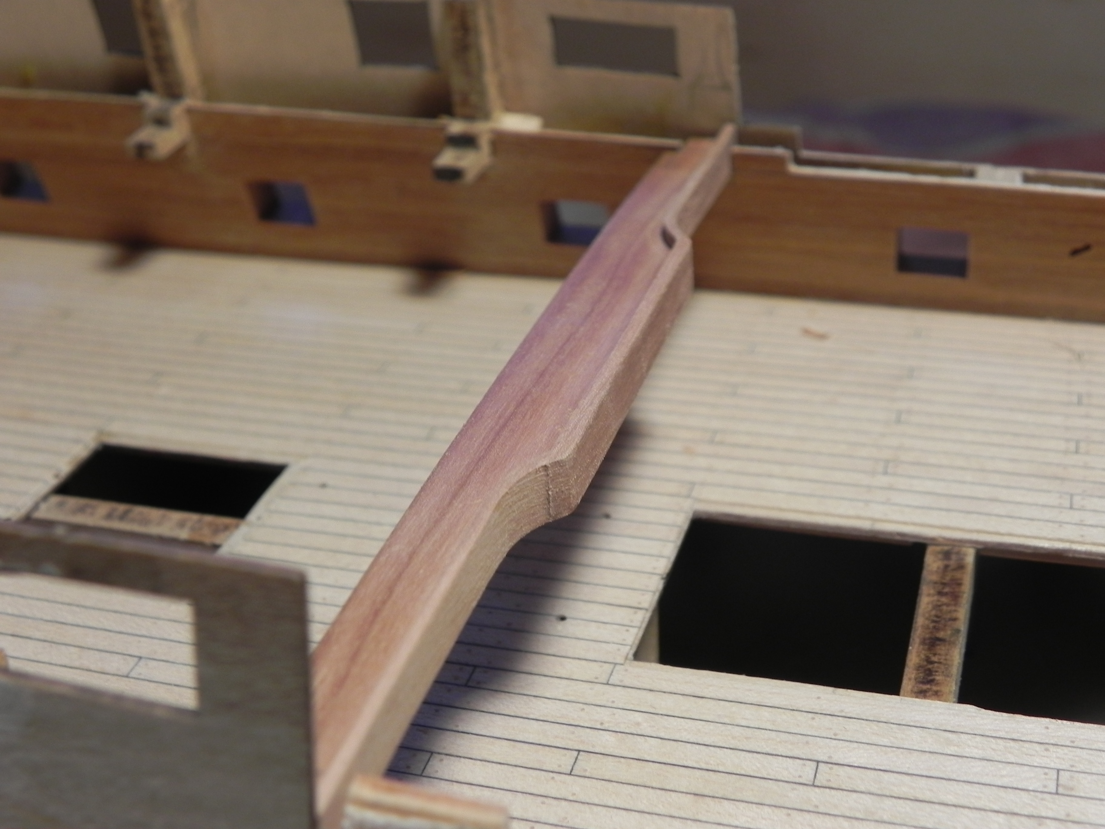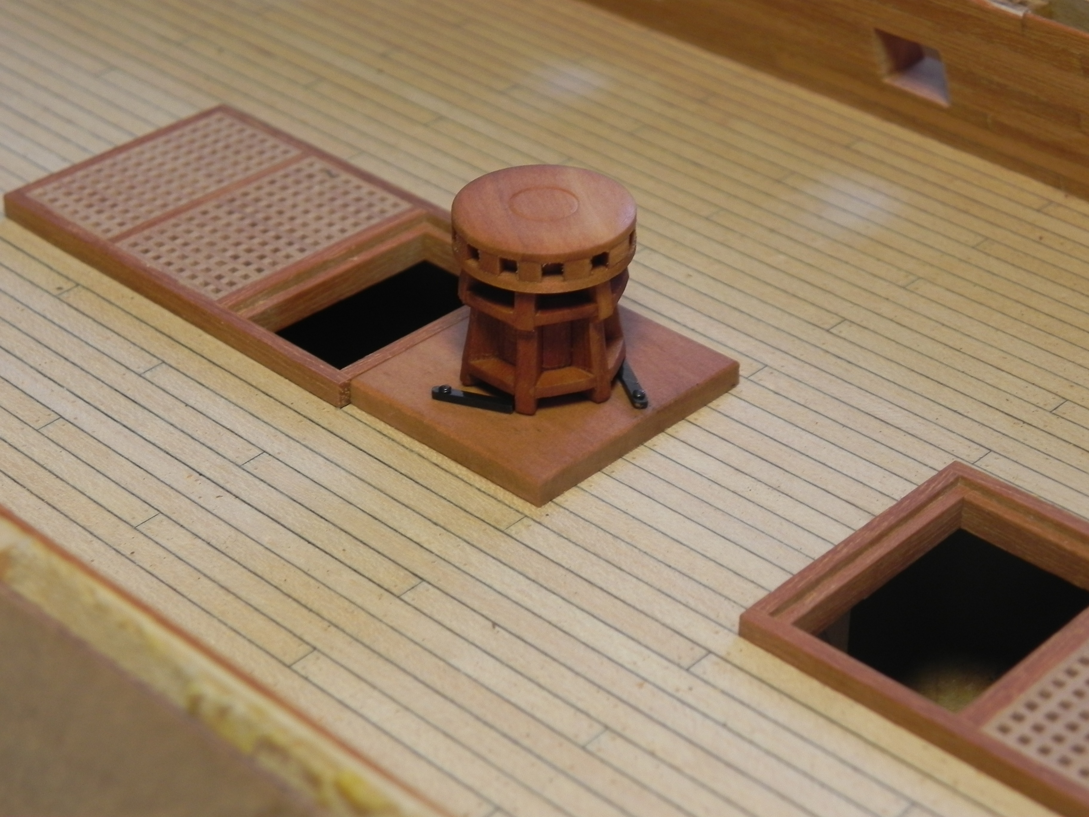 Увидев на твоих фото фальшь-палубу квартердека, я вспомнил, ещё один "косяк" Амати: два прямоугольных люка, что находятся по обе стороны от грот-мачты, Амати почему-то сильно отодвинула от мачты. Возможно, это связано чисто с изготовлением КИТа. Однако, на моделях из НММ эти люки (для проводки такелажа вниз, к битенгам опердека) расположены как можно ближе к основанию мачты. "Скелет" на модели Т. Слейда очень хорошо это показывает.