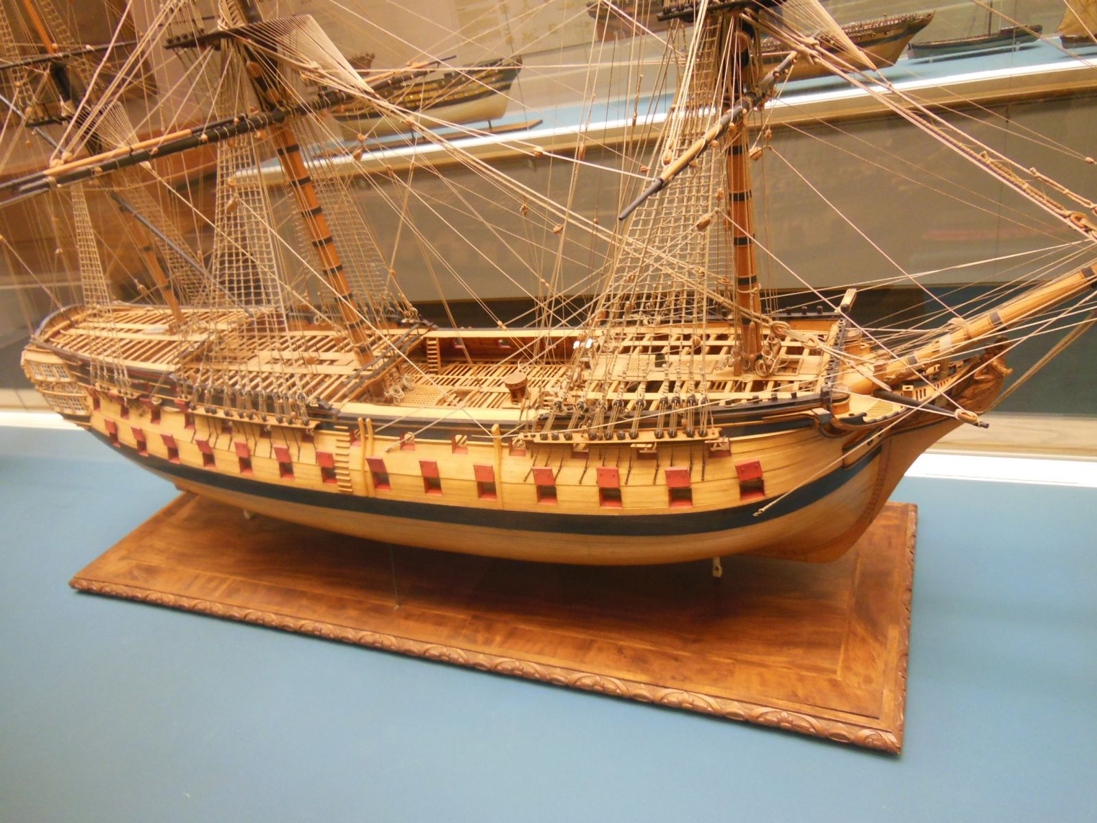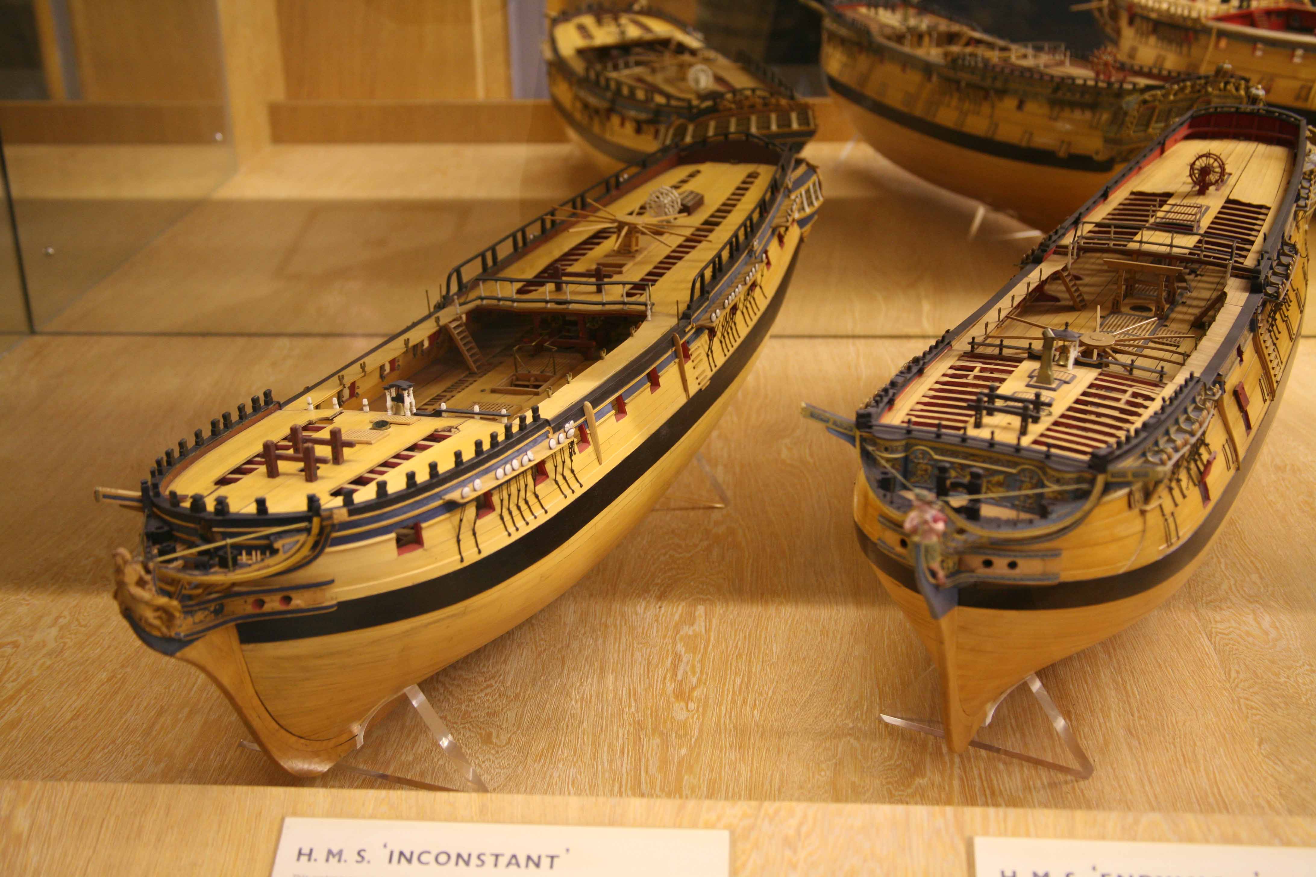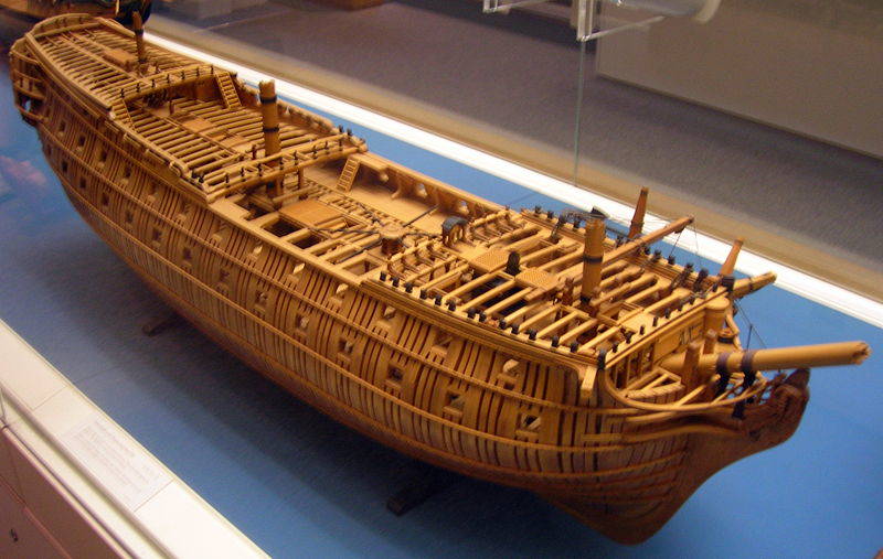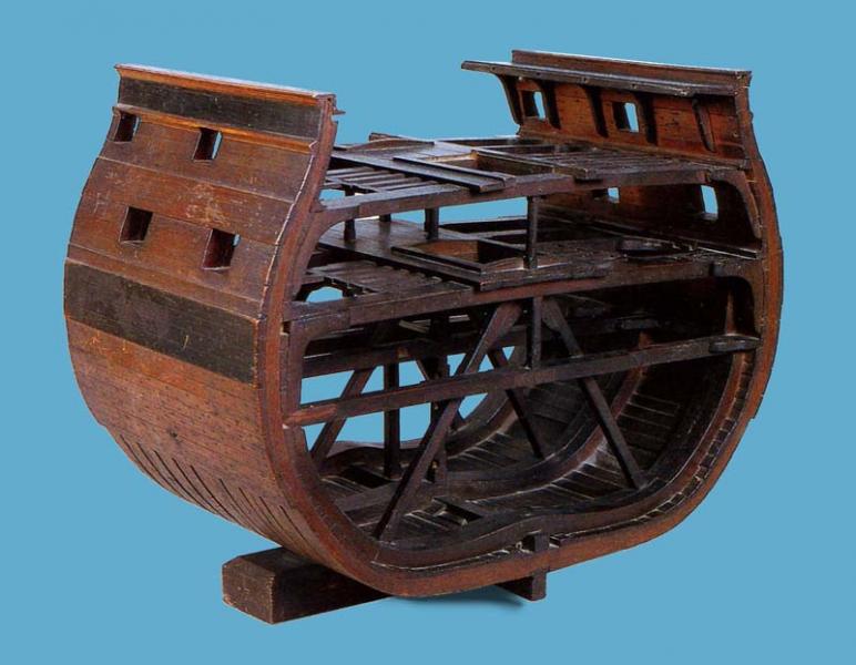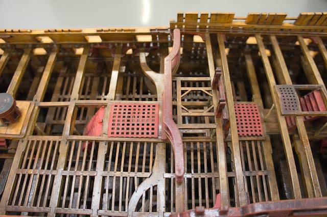 А что же с мостиками? Они не были на уровне настила палуб, а были на высоте нижнего среза бимсов этих палуб. Это подтверждает настоящий чертёж Томаса Слейда. Ширина мостиков тоже была меньше, и, судя по моделям в НММ, не сильно регламентировались.