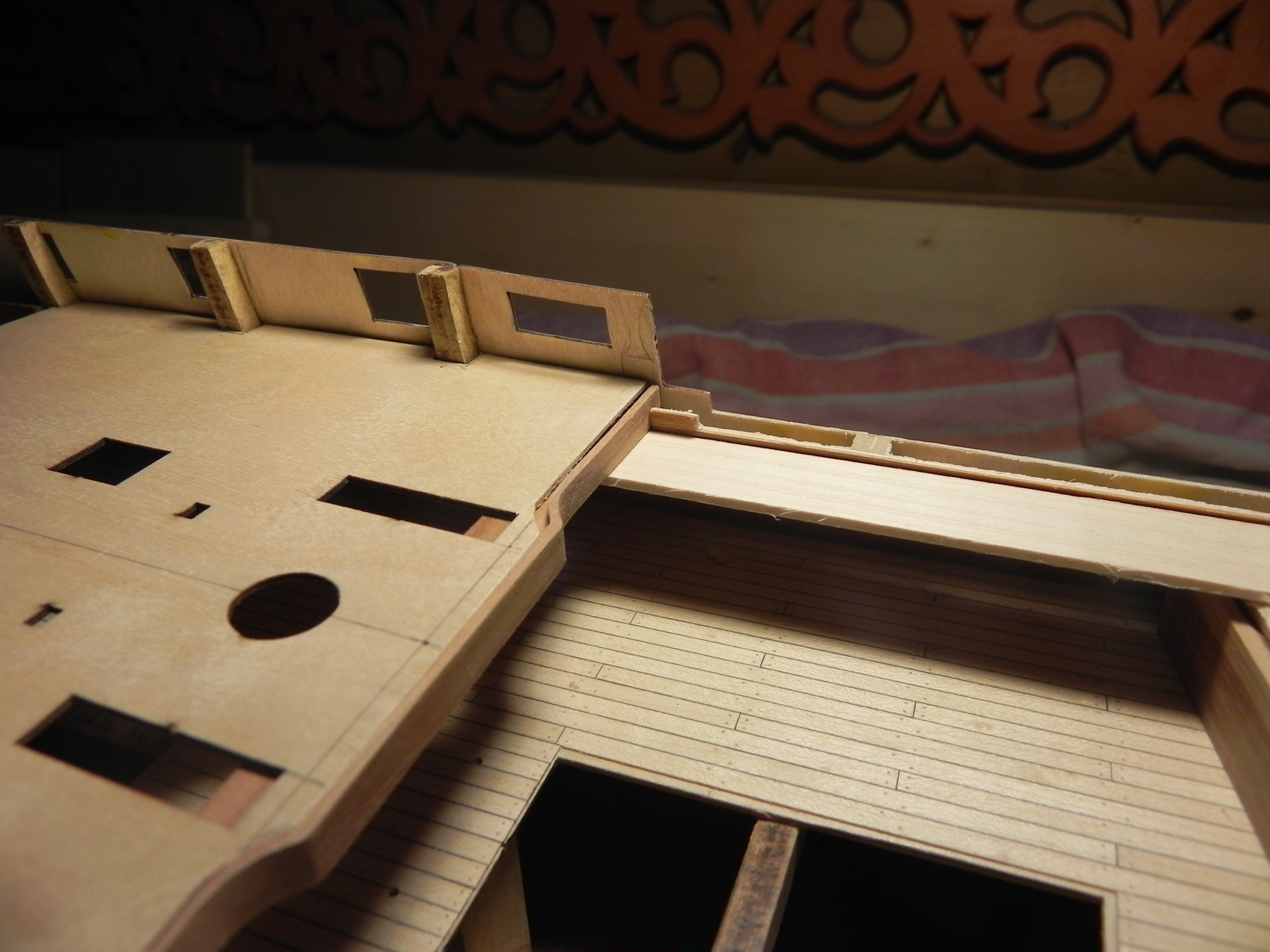 Игорь, добрый вечер. Когда решил резать фальшборт по новому чертежу , понял ,что  нет точки откуда начинать, все завязано.И пришел к выводу, что разумнее будет начинать  с двух бимсов,которые справо и лево от мостков. Поскольку мостки ниже бимсов, значит надо определить место бимсов.Заодно и бимсы переделал, сделал их с бортиком,куда ляжет настил. Жду замечания. И еще, про ширину мостков. Решил оставить ту ширину , которая была в наборе. А вот теперь от бимса можно резать фальшборт.
