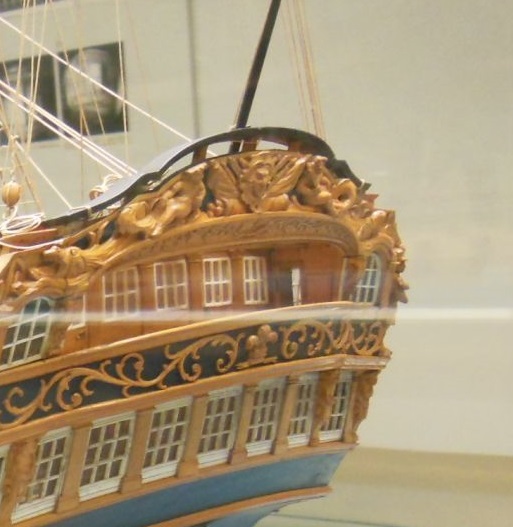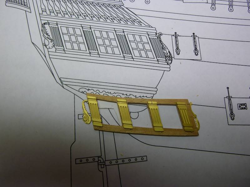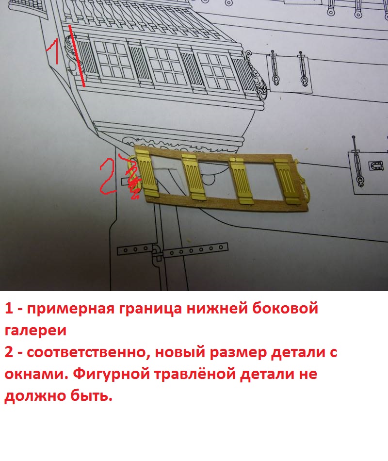 "Продолжаем разговор", как говорил Карлсон. И вновь кормовые галереи. Как было описано в сообщениях выше, из-за того, что так называемые "верхняя" и "нижняя" плита не находятся в одной плоскости, у Амати "выросла" нижняя боковая галерея. Обращаем внимание на деталь 162 и 434. Многие моделисты на это обращают внимание и удаляют "задний кусок" детали 162,за колонной, где и "выросла" деталь 434. Про размер дет 162 лучше всего показывает фото, а деталь 434 в природе не существовала, на самом деле это была декоративная опора, поддерживающая фут-реельс. Как выглядела примерно эта опора, судя по детали 434, можно посмотреть по корме Виктори.