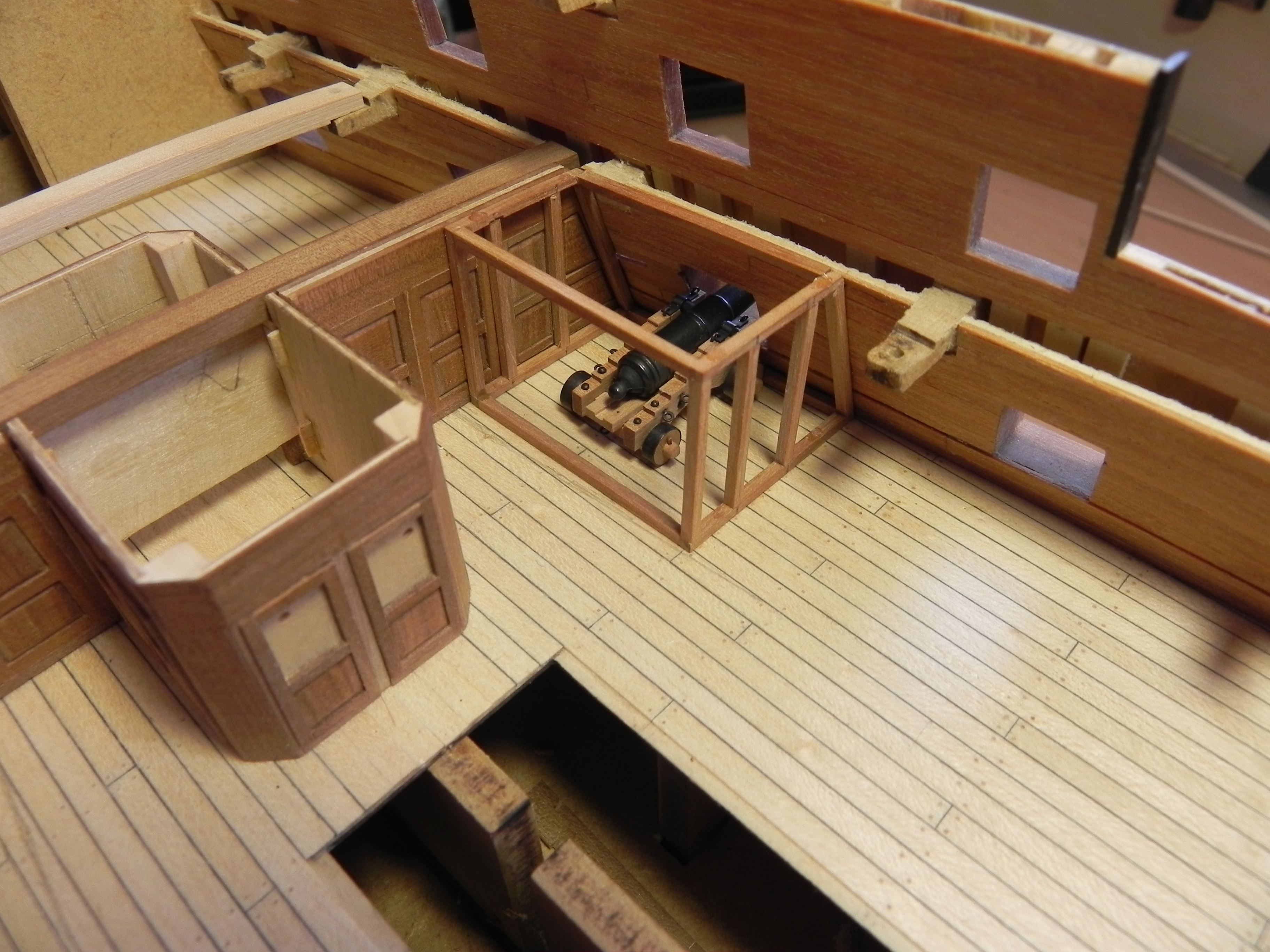 Считаю, что достаточно просто собрать деревянную часть (модели печи Амати), окрасить в чёрный, поставить на место, а потом возвести стенки (переборки) камбуза. Про стенки камбуза известно только то, что они были разборными, причём боковые переборки были глухими, и лишь переборка, смотрящая на фок-мачту, имела две большие распашные двери - здесь было рабочее место кока.