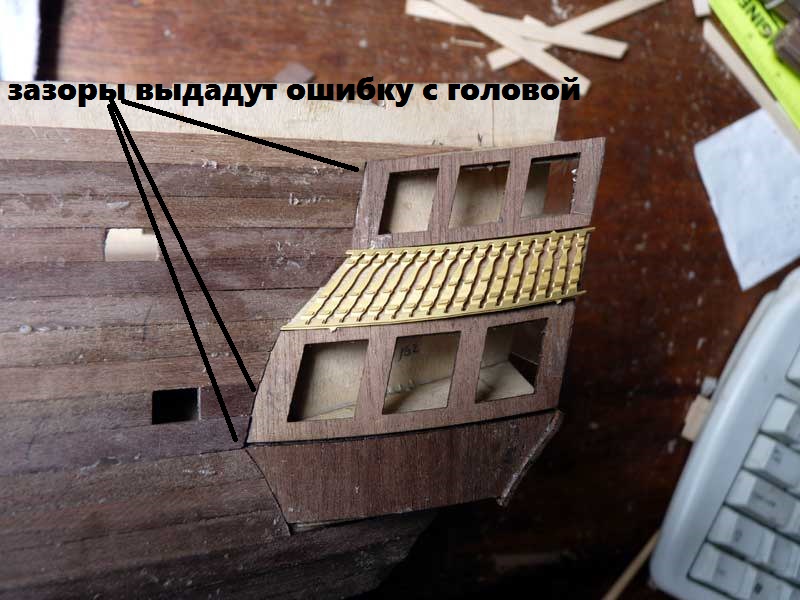 Повторю, чистовая обшивка должна продолжаться внутри боковых галерей. Я бы посоветовал разобрать боковины галерей, тем более, что верхнюю галерею всё равно надо смещать, о чём мы уже говорили вот здесь:http://www.shipmodeling.ru/phpbb/viewto ... &start=315