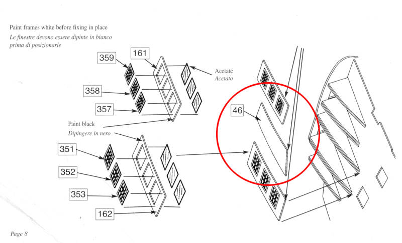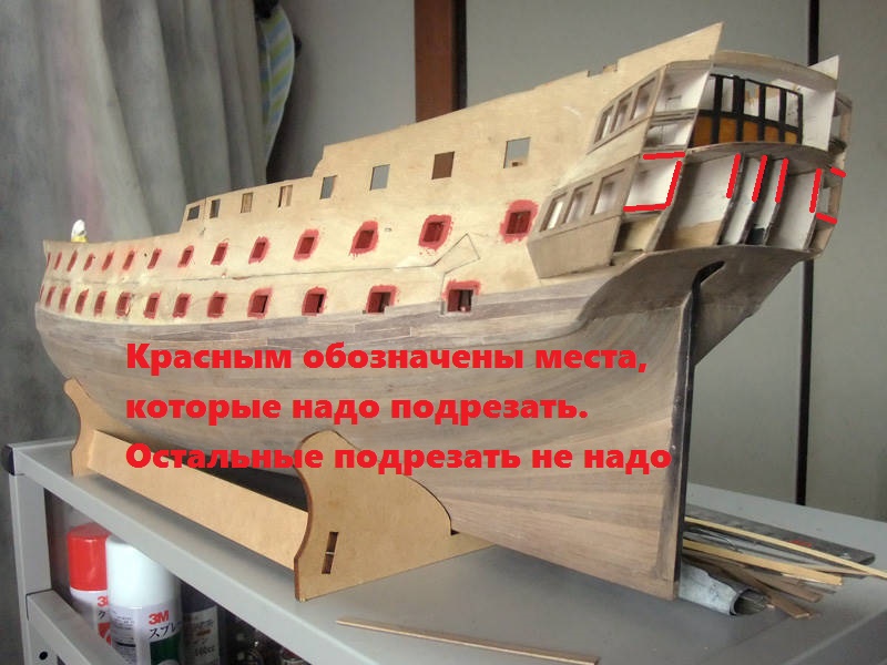 Ну, всё, начинаем хирургию. Фирмой Амати предполагалось, что данная деталь (окна нижней галереи) будет приклеена внахлёст на каркас нижних боковых галерей, на рамы окон боковых галерей (дет. 162) , на контр-тимберсы каркаса корпуса и на подзор.