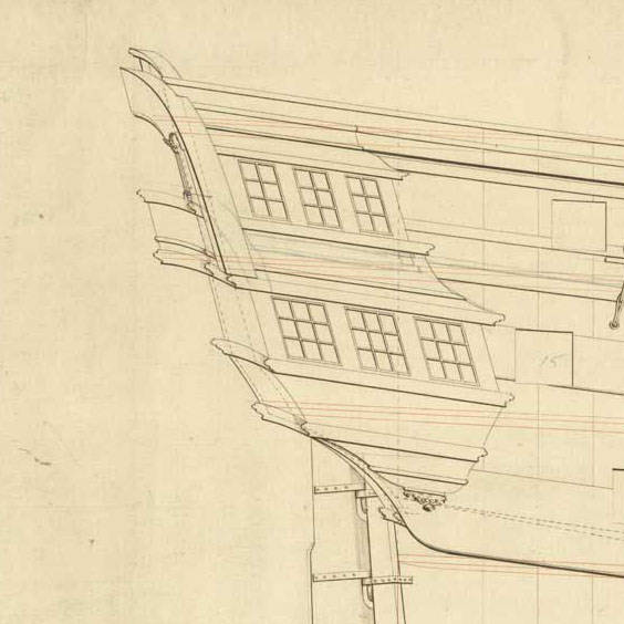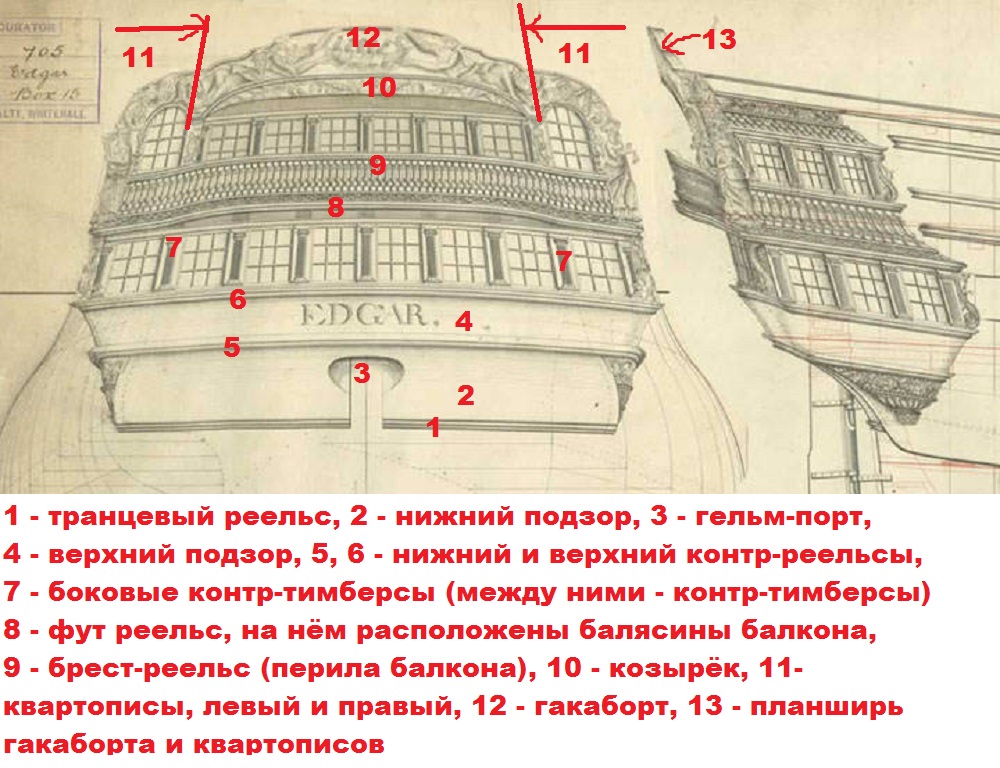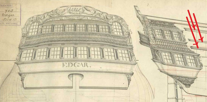 Вот ты ругаешься, что "много материала". На самом деле, это я ещё упростил и выкинул кучу текста, и ситуация с окнами на корме - это целая песня, книги писать можно: Кстати, исторический чертёж, один из "первой троицы" кораблей проекта данной серии, Дрэгон. Здесь можно увидеть сечение фут-реельса на балконе. А ещё поможет сделать двери в боковые галереи: