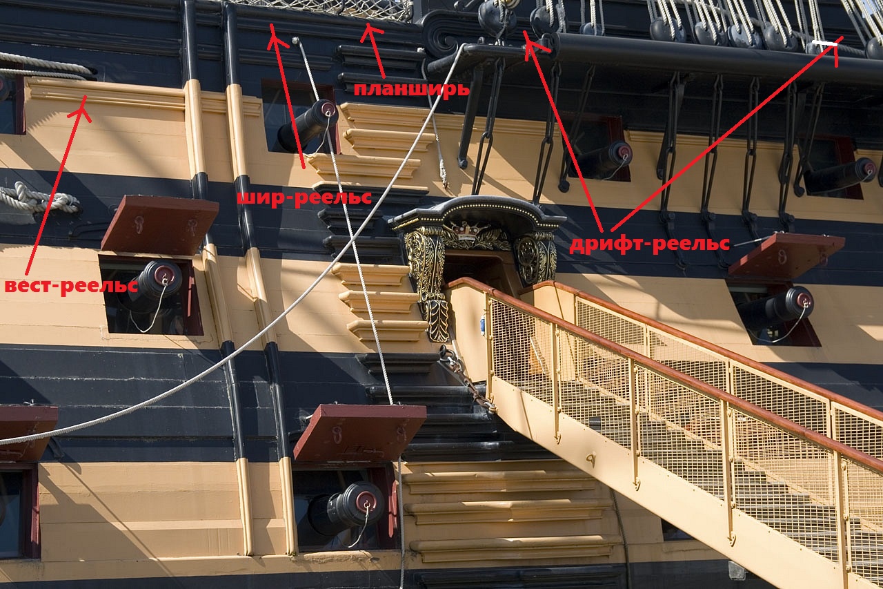 На рубеже 18-19 веков от вест-реельса постепенно отходят. На его месте - обычный пояс обшивки, а сверху прибивали декоративный молдинг (в те времена вся толщина обшивки выросла, смысла в вест-реельсе больше не было... кстати, та же участь позже ждала и бархоуты). "Фальшивый" вест-реельс показан на корабле-музее Виктори, "фальшивый" вест-реельс встречается на моделях периода нулевых годов. Впрочем, на Виктори все реельсы фальшивые, кроме шир-реельса.