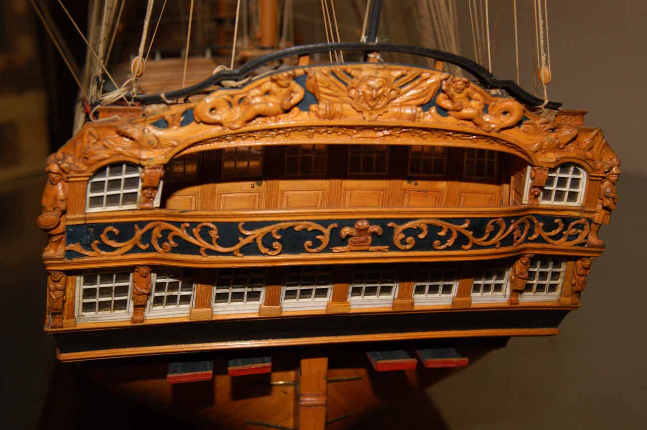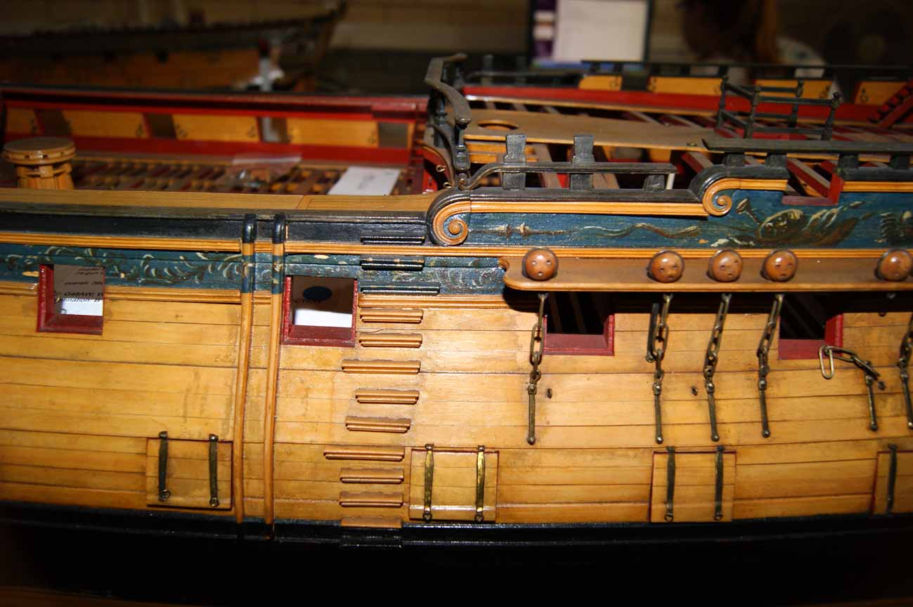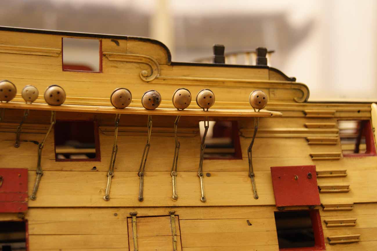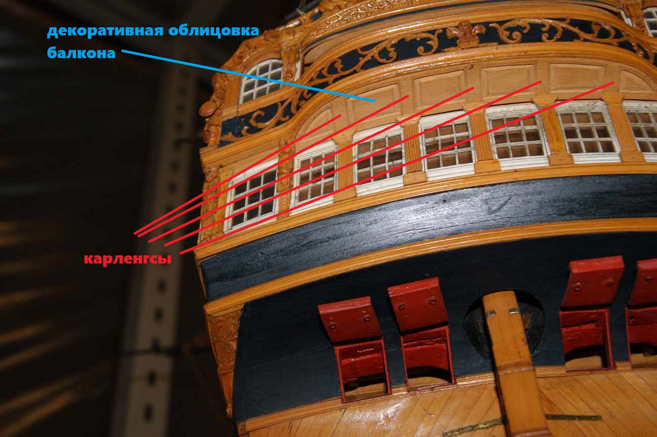 На прототипе же никаких оконных рам нижней галереи не существовало. Окна ставились заподлицо с контр-тимберсами, а вот гакаборт и квартописы верхней галереи присоединялись снаружи контр-тимберсов, т.е. внахлёст. Это отлично видно на модели Беллоны, у которой, нам на радость, отсутствуют боковые галереи.