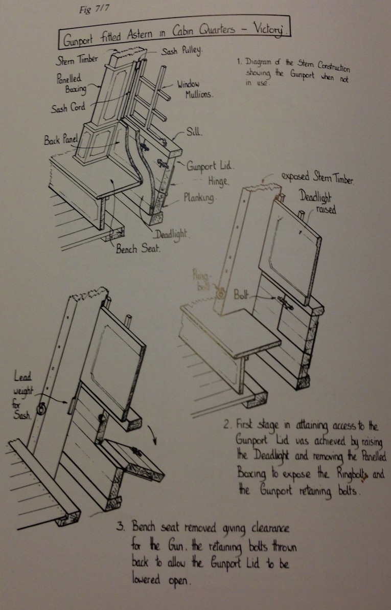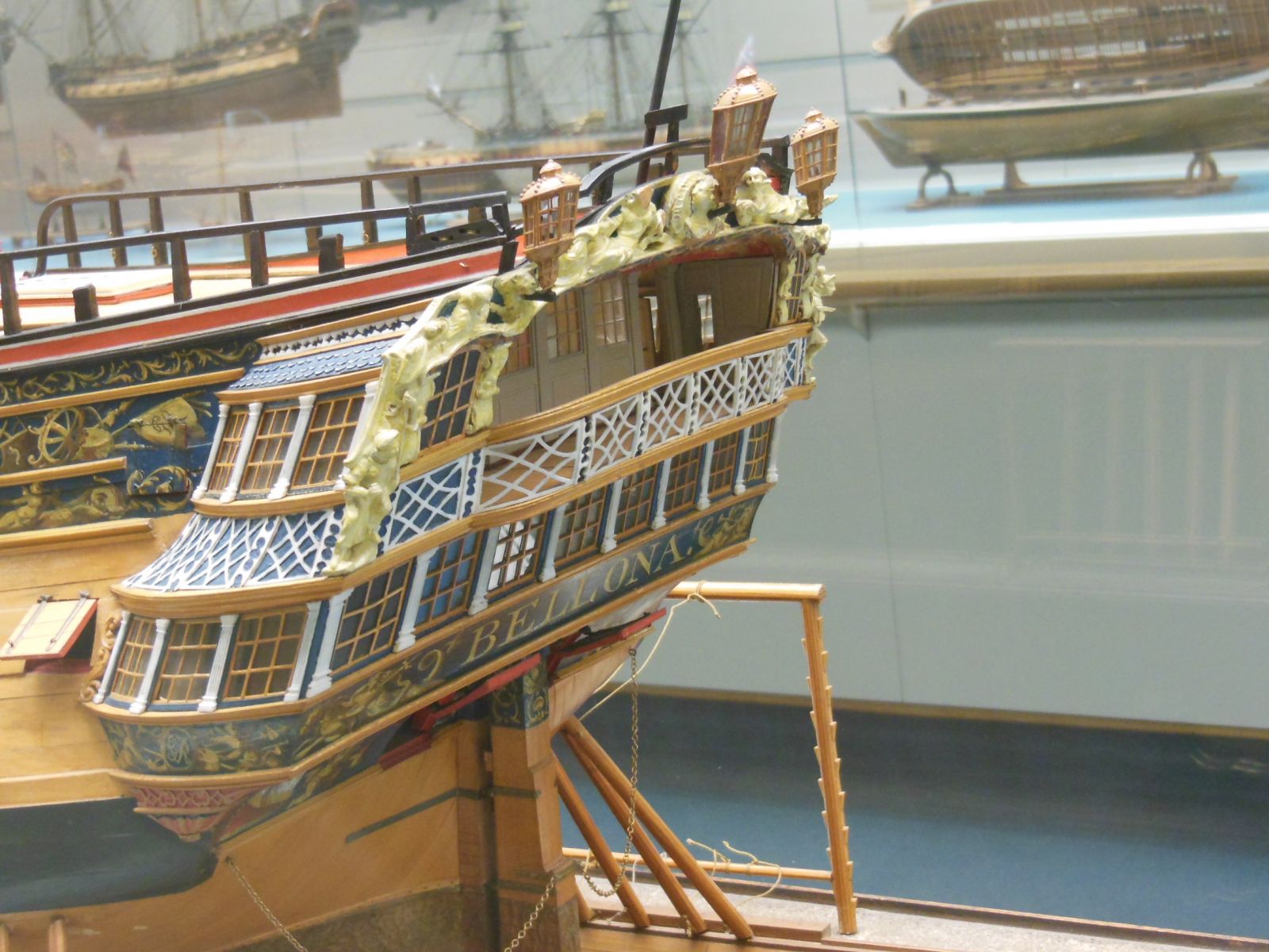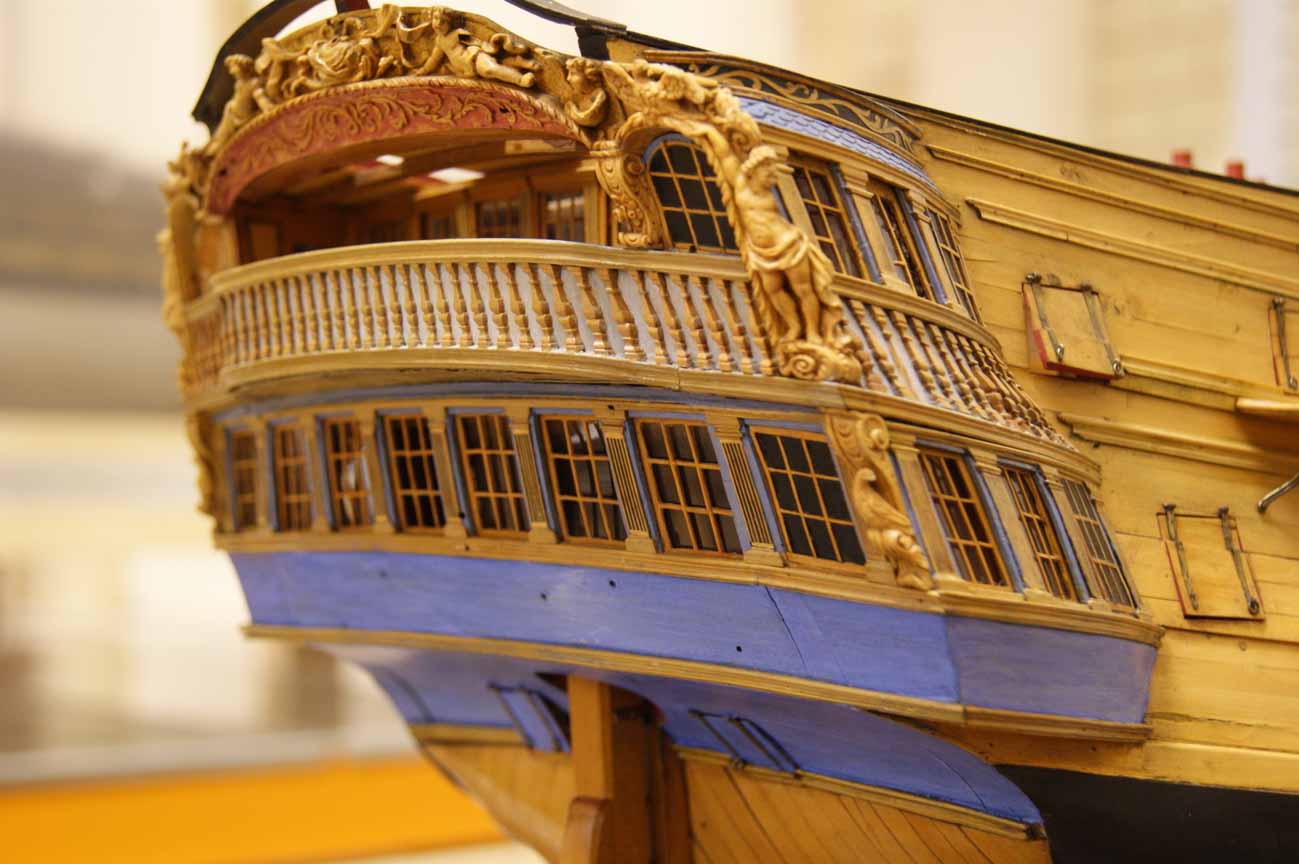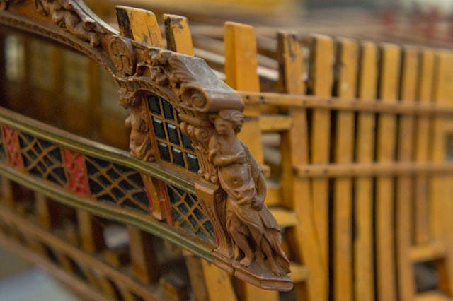 На прототипе же никаких оконных рам нижней галереи не существовало. Окна ставились заподлицо с контр-тимберсами, а вот гакаборт и квартописы верхней галереи присоединялись снаружи контр-тимберсов, т.е. внахлёст. Это отлично видно на модели Беллоны, у которой, нам на радость, отсутствуют боковые галереи.
