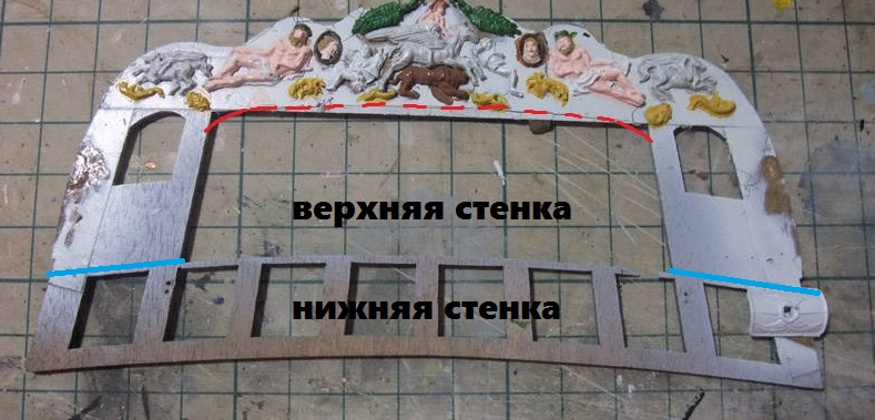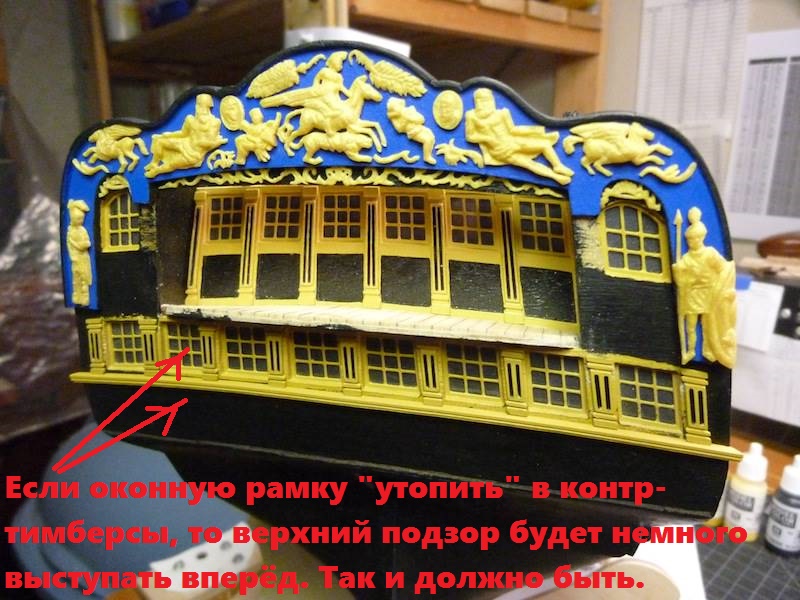 Итак, из истории вопроса. Амати сделала кормовую панель, где присутствуют "оконные рамы нижней галереи" внизу и "гакаборт, квартописы и вырез под балкон" в верхней половине панели. На фото детали я назвал их "верхняя и нижняя стенка"