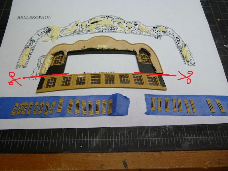 Приступаем. На кормовой панели отрезаем оконный переплёт нижней галереи от гакаборта с квартописами верхней галереи. Разрез делать по линии балкона.