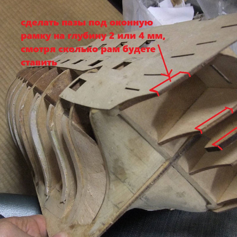 1. Заклеиваем фанерой боковые арочные окна, потому что они были слепыми, то есть фальшивыми. Но сами окна сделать придётся, накладными, и под стёклами будет видна фанера, окрашенная в чёрный цвет. Далее. Изменяем абрис верхнего выреза, там, где козырёк.