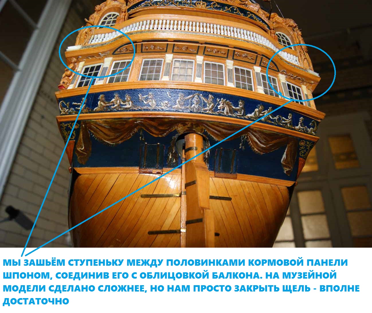 Так же, до самого конца корпуса, т.е. до боковых контр-тимберсов, должен проходить и бархоут. Иногда его по ошибке обрывают перед боковой галереей.