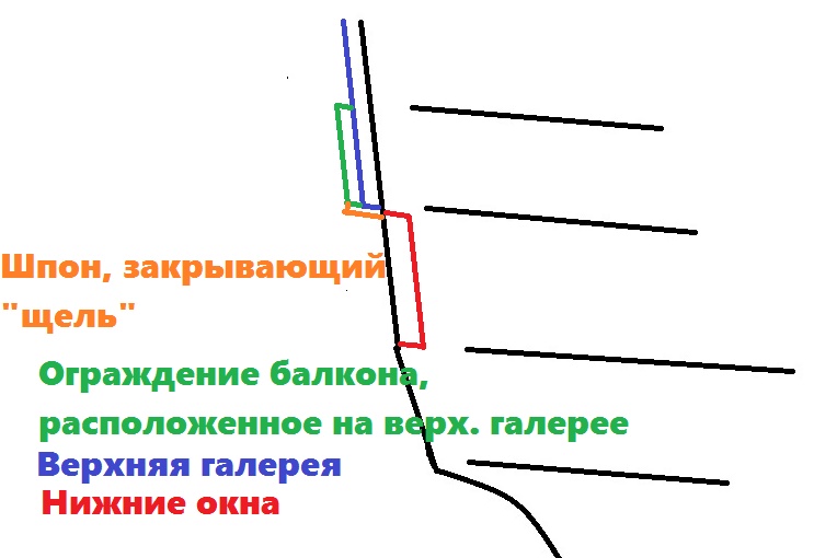 Получается, что гакаборт верхней галереи и оконный переплёт нижней галереи не были одной плоскостью, как сделала Амати (дала эти элементы единой деталью). Оконная рама (условная) и гакаборт были в разных параллельных между собой плоскостях. Образовавшаяся ступенька между ними (утеряная Амати) должна быть нами "зашита" и прикрыта декоративным молдингом под названием фут-реельс. Эта сильно выступающая деталь находится прямо над окнами нижней галереи и сильно выступает наружу при виде снизу. Сверху фут-реельс не так заметен - всё из-за этой самой ступеньки.
