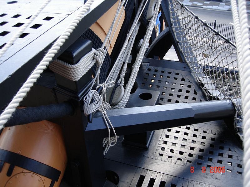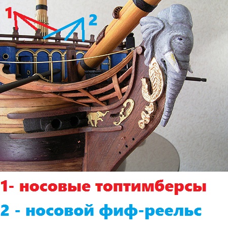И ещё, чтобы не было путаницы, учтите, что в дальнейшем название "фиф-реельс" закрепилось за кофель-нагельными планками, так что не смущайтесь, читая, например, Кембелла. Забегая вперёд: мы уже обсуждали, что на нашей модели, кофель-нагельных планок не было, их появление датируется 1798 годом, вместе с повышенными фальшбортами.