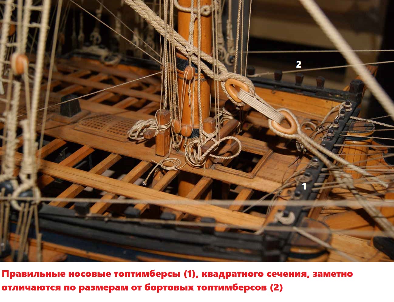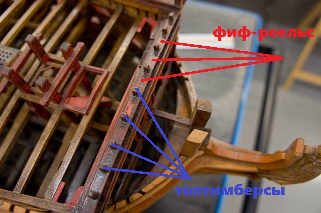 Что нам важно для переделки? Амати здесь накосячила с носовыми топтимберсами и носовым фиф-реельсом, расположенными наверху переборки.