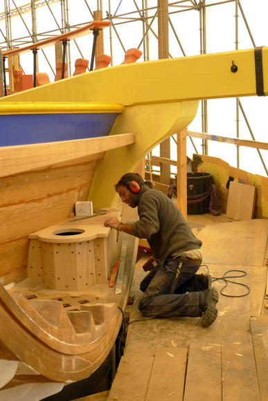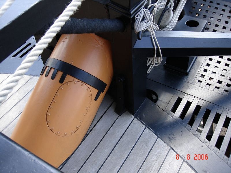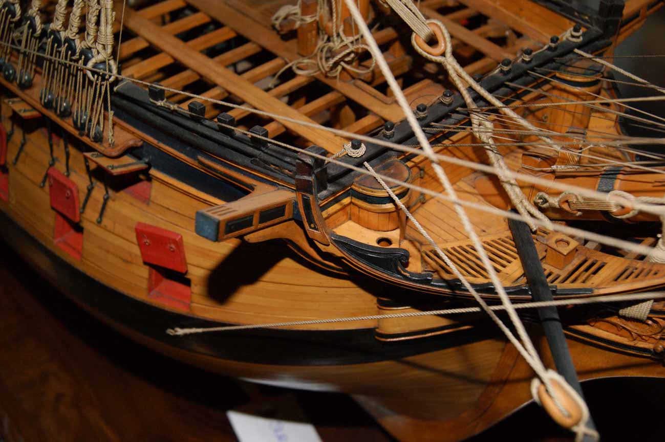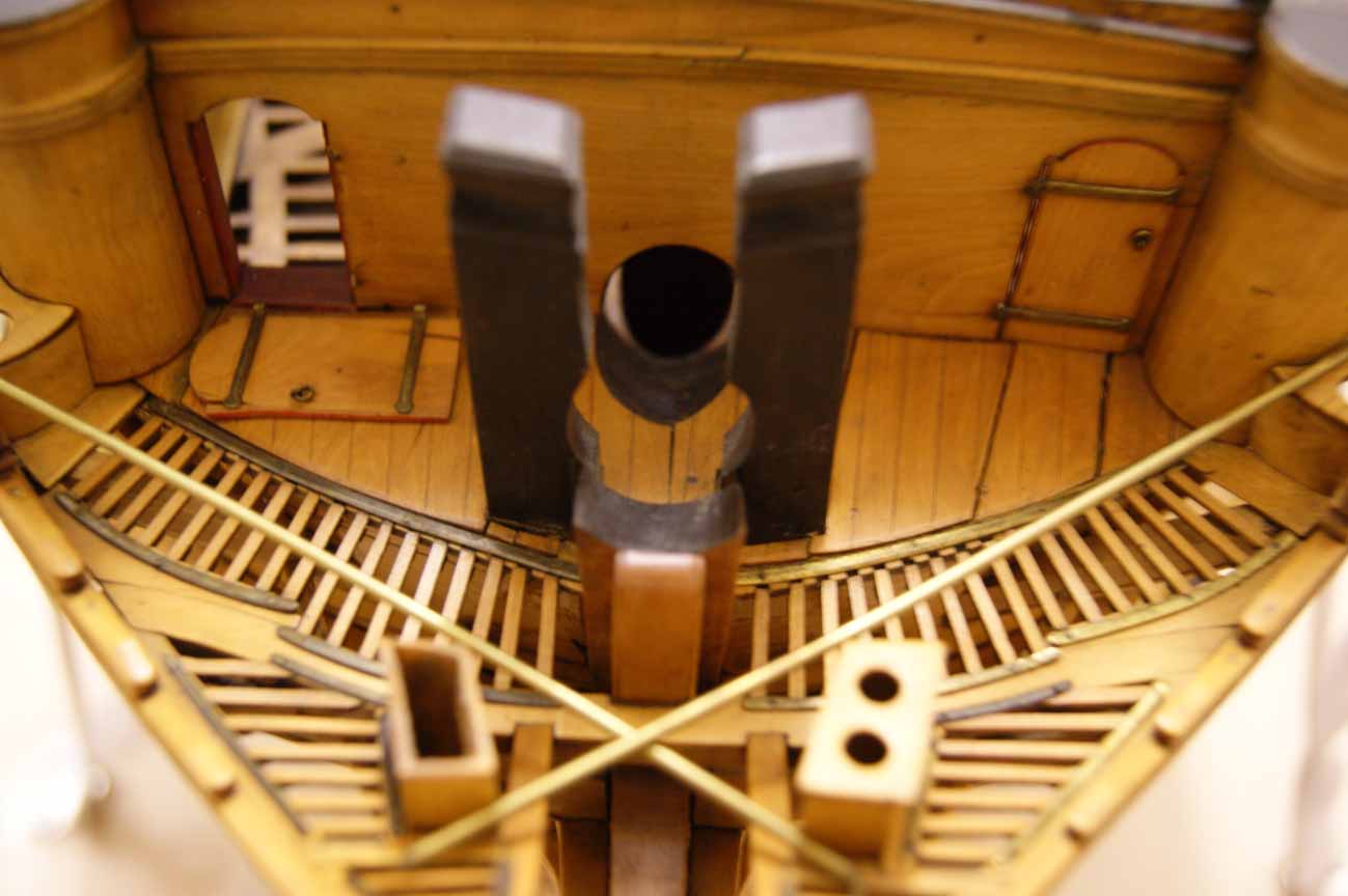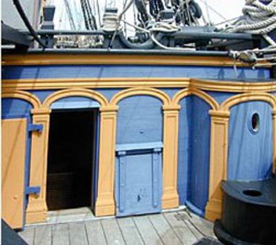 На фото хорошо видно, что для дверей и пушечных портов тимберсы являются элементом каркаса. На модели отсутствуют полукруглые выгородки мичманских клозетов, но показаны тимберсы, на которые крепятся двери этих клозетов (открывались во внутрь корпуса):