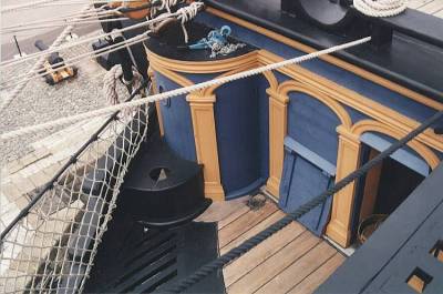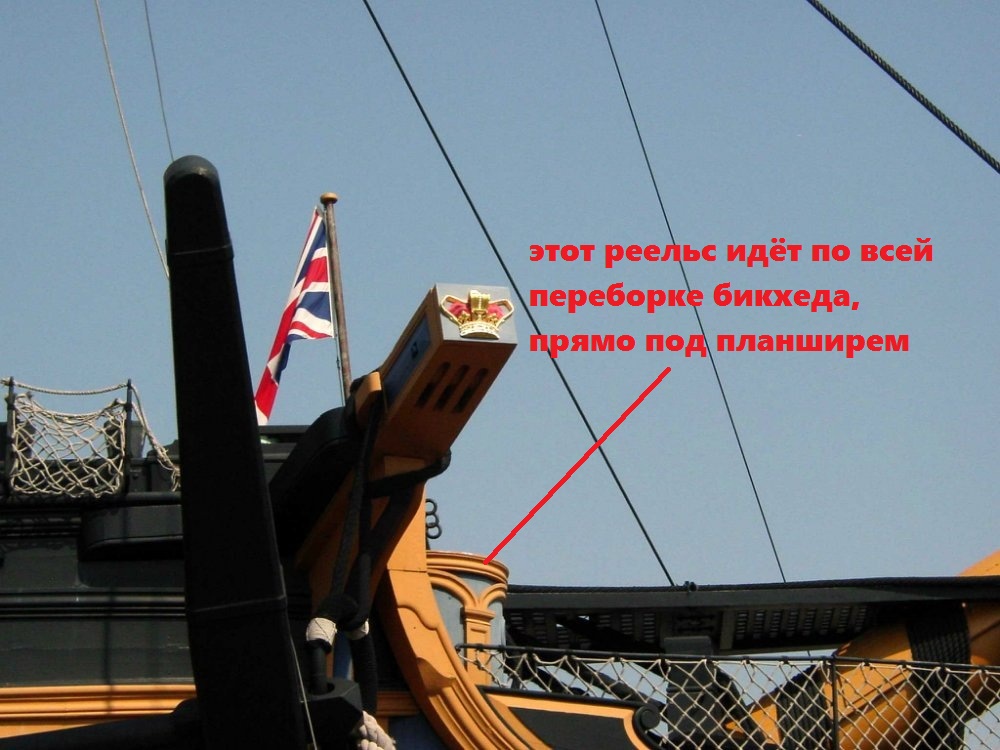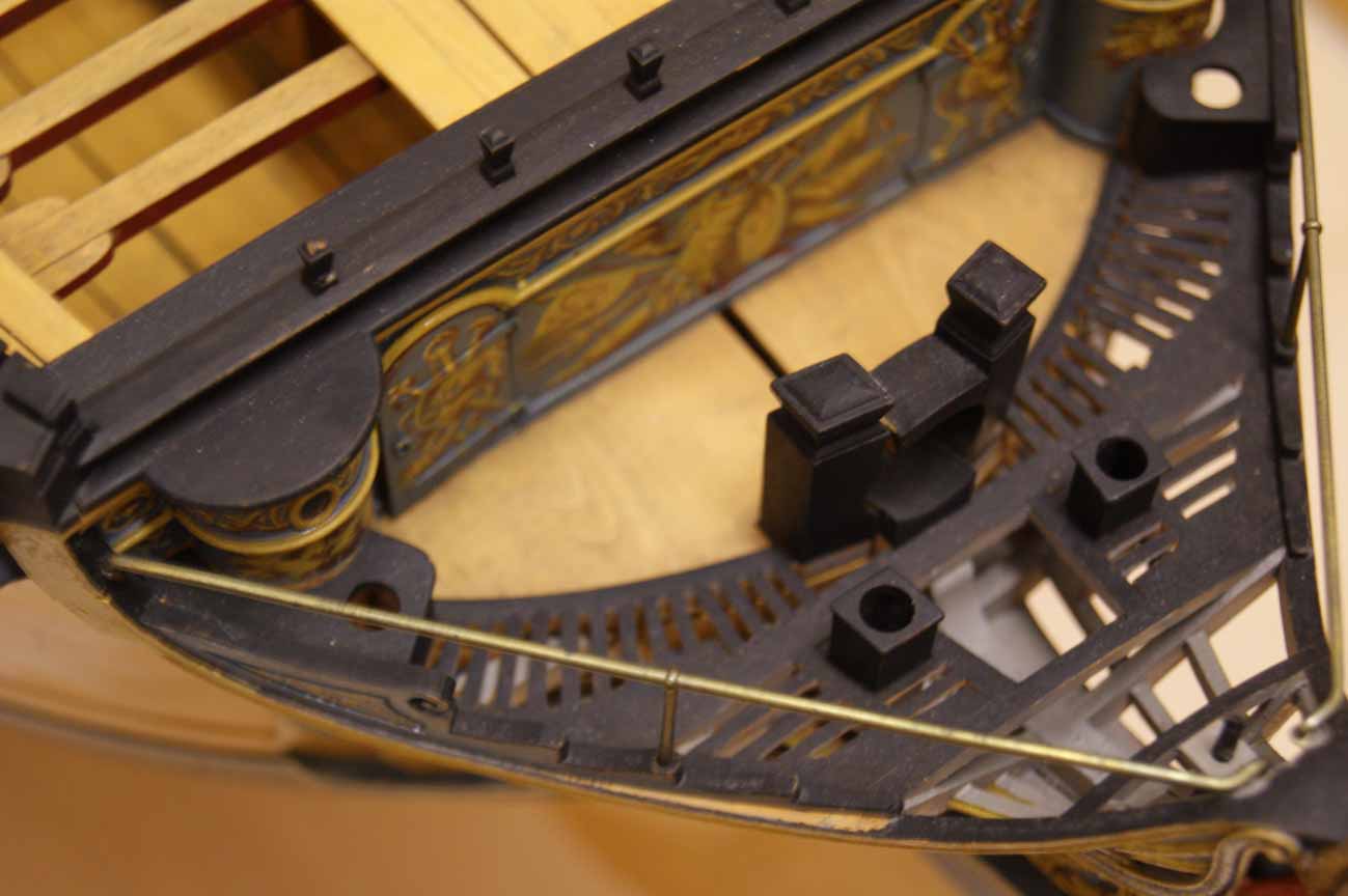 Обратите внимание, на решётке гальюна, а так же возле клозетов мичманов (roundhouse которые) есть и матросские сидения, штульцы. Расположенные на палубе бикхеда штульцы фирма Амати проигнорировала, а штульцы, расположенные на решетке гальюна, она приблизила к бушприту так, что на штульце невозможно сидеть. А экипаж-то, вместе с морской пехотой, 800 человек был...