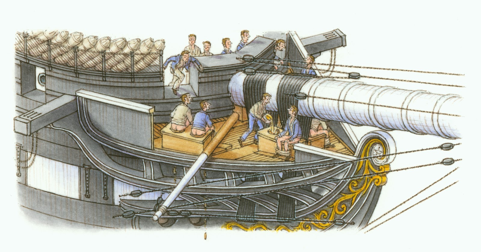 "Затем мы облегчались в гальюне, расположенном в носовой части. На всю команду в 250 рядовых моряков было только два сидения, и первым делом матросы лезли на бушпритную сетку с подветренного борта и мочились прямо в волны. При бурном море и сильном ветре холод пронизывал не хуже кинжала. Начало дня было жестким – особенно после тепла и духоты кубрика – и мгновенно прочищало голову от остатков сна.
