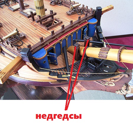 Так вот, эти ужасные овальные отверстия в сделанных заново недгедсах сверлить не надо. Чаще всего штаг-краг просто охватывает недгедсы своей петлёй снаружи. Чтобы он не перетирался, с наружних сторон недгедсов прибивались пластины (щёки) из мягкого дерева с закруглёнными, "заваленными" фасками - так краг имел меньший угол изгиба. А, если такие отверстия для штаг-крага в недгедсах были, то они круглые, и сделаны под углом линии прохождения крага. Выбор за вами. Такие отверстия на музейных моделях - редкость.