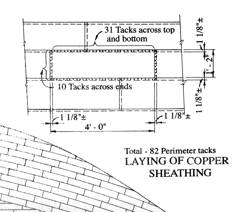 Чтобы уменьшить возросшее при такой укладке медных листов гидродинамическое сопротивление, Мидлтон распорядился укладывать медную обшивку по определённой схеме. Кратко схему можно описать так: листы начинать класть от ахтерштевня к форштевню (с кормы в сторону носа) и от ватерлинии к килю (т.е. ещё и сверху вниз). При этом поясья медной обшивки класть по пути наименьшего излома линии, то есть, практически параллельно резен-линии. Вот почему поясья медной обшивки не параллельны ни палубам, ни ватерлинии, ни поясьям деревянной обшивки. Такая укладка не только была оптимальной в плане гидродинамики, но и экономила материал.