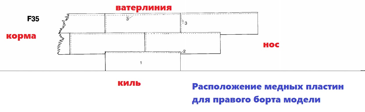Наклеиваем на неё поперёк медные пластины так, чтобы они немного выступали с краёв. Длина ленты пусть будет такой, чтобы пластины лежали на корпусе вдоль мидель-шпангоута, от киля до бархоута.