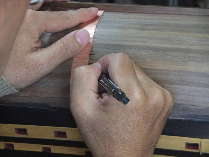 Смотрим на чертёж, находим центральный ряд, от которого поясья серпообразно идут вверх, в нос и корму. Обычно это как раз середина корпуса. Так как киль и штевни обшивались отдельно, это нам на пользу. Нашли центральный ряд на модели, прижали нижнюю пластину к шпунту киля, приложили все пластины к корпусу. Теперь карандашом, начиная снизу, отмечаем на корпусе каждую пятую пластину. Отступив некое небольшое расстояние вправо-влево и опять упираясь в киль, отмечаем на корпусе каждую пятую пластину. И так делаем до самого форштевня и ахтерштевня. Соединяем одноимённые точки в линию. Если у нас правильные обводы корпуса, то получатся точно такие же линии поясьев медной обшивки, как на чертежах. Всё. Теперь клейте медь, как вам удобнее.